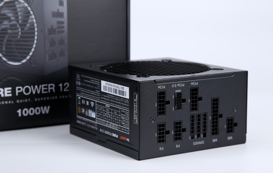电源方面,除了满足全新RTX40系显卡和14代酷睿功耗需求,静音也是我们所追求的,所以选择的依旧是德商德静界旗下的Pure Power 12M 1000W金牌全模组电源。纯黑的配色,搭配上电源外壳表面的电镀耐磨涂层,看起来质感满满。电源原生支持ATX 3.0电源标准与PCIE 5.0电源协议,1000W的大容量,也能充分满足绝大多是顶配主机的功耗需求。电源内置一颗120mm 超静音风扇,并支持智能温控调节。