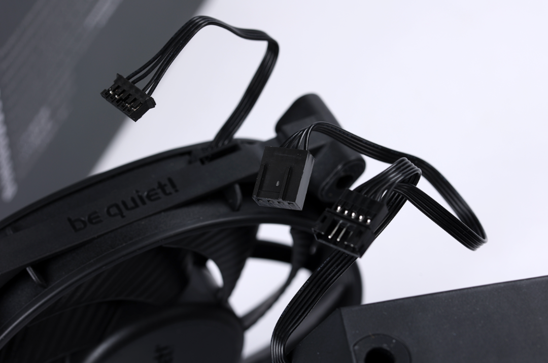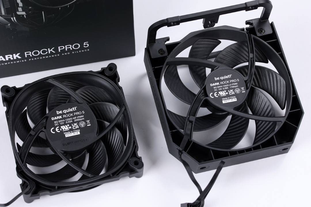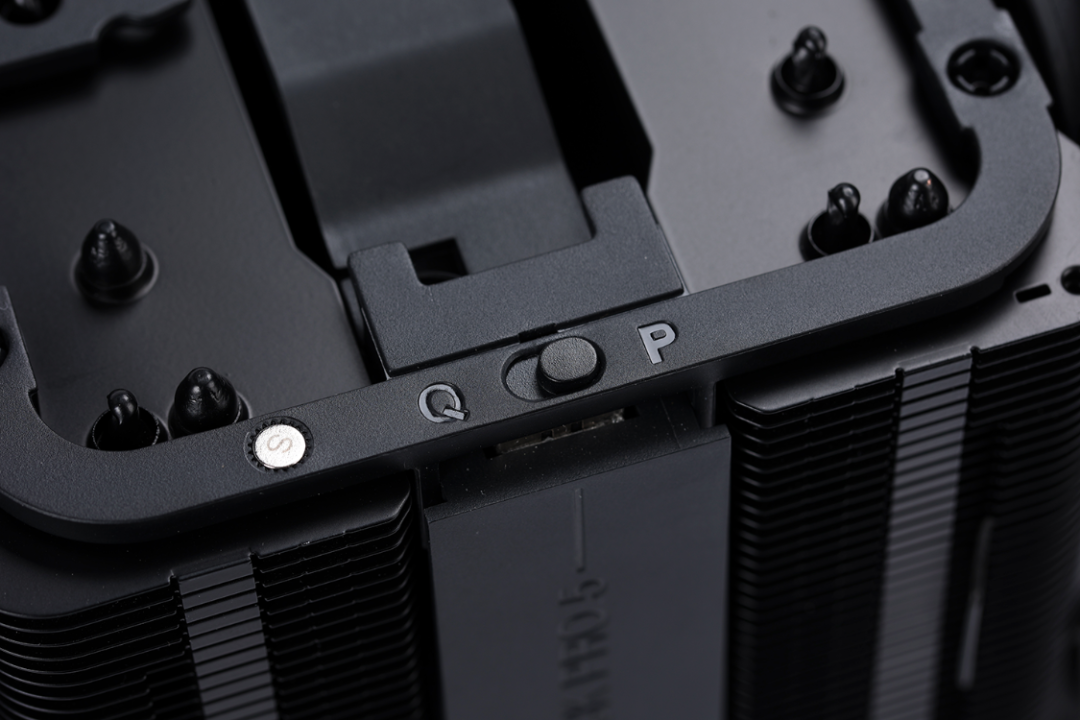 风冷标配1把120mm(Silent Wings 4 )和1把135mm(Silent Wings 定制尺寸)规格的黑色静音散热风扇,并且两把风扇都已经预装至散热塔体上。两把风扇通过独特的7Pin供电线材接口进行串联,并通过支持PWM调速的4Pin供电接口链接至主板。风扇采用了两档手动转速调节设计,通过隐藏在顶盖下方的模式切换开关,可以让玩家根据实际使用需求,自己选择风扇的转速设置。