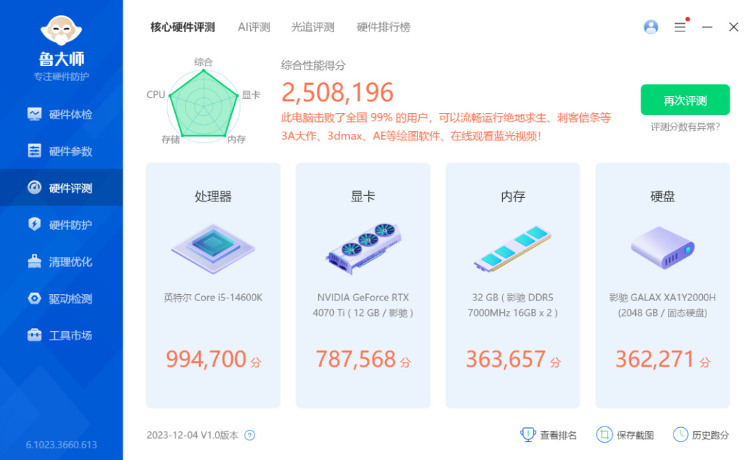 明知super系列的40显卡不久就要发布,现在选4070Ti装机,是不是智商税?至少个人并不认可,且不论售价几何,至少时间上你也还得等上一两月才能用上,那跟我当下装机又有什么关系呢?所以不论何时,146K+4070Ti+高频DDR5内存的组合,都会是相当能打的配置,无外乎不同时间段,我们每个人入手的价格可能存在差异。(再补一刀:1650的14600KF,5100左右的4070Ti金属大师显卡,在抖爸爸电商平台,是真的能买到的。)