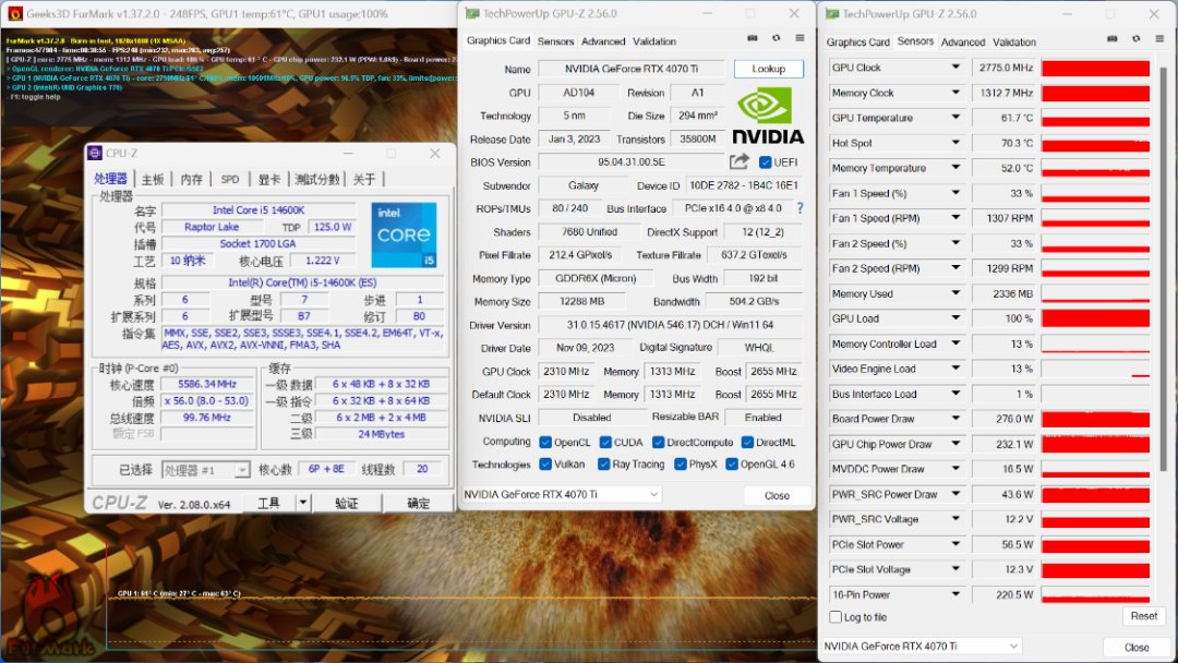 FurMark烤机测试,机箱内环境,烤机30Min,显卡温度为62°左右,显卡功耗为280W左右;