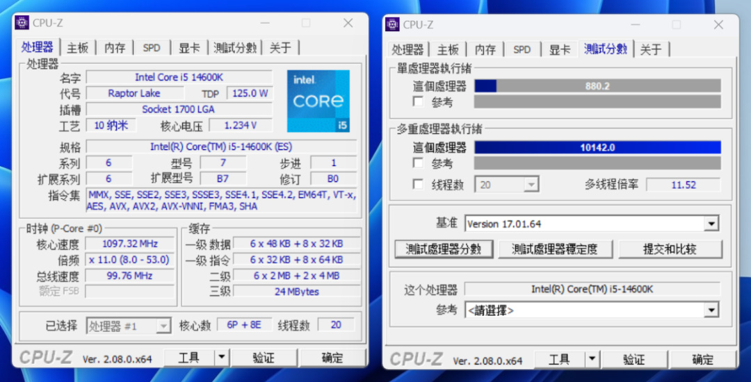 CPU-Z基准测试,CPU自动睿频状态下,单核得分880.2分,多核得分10142分;