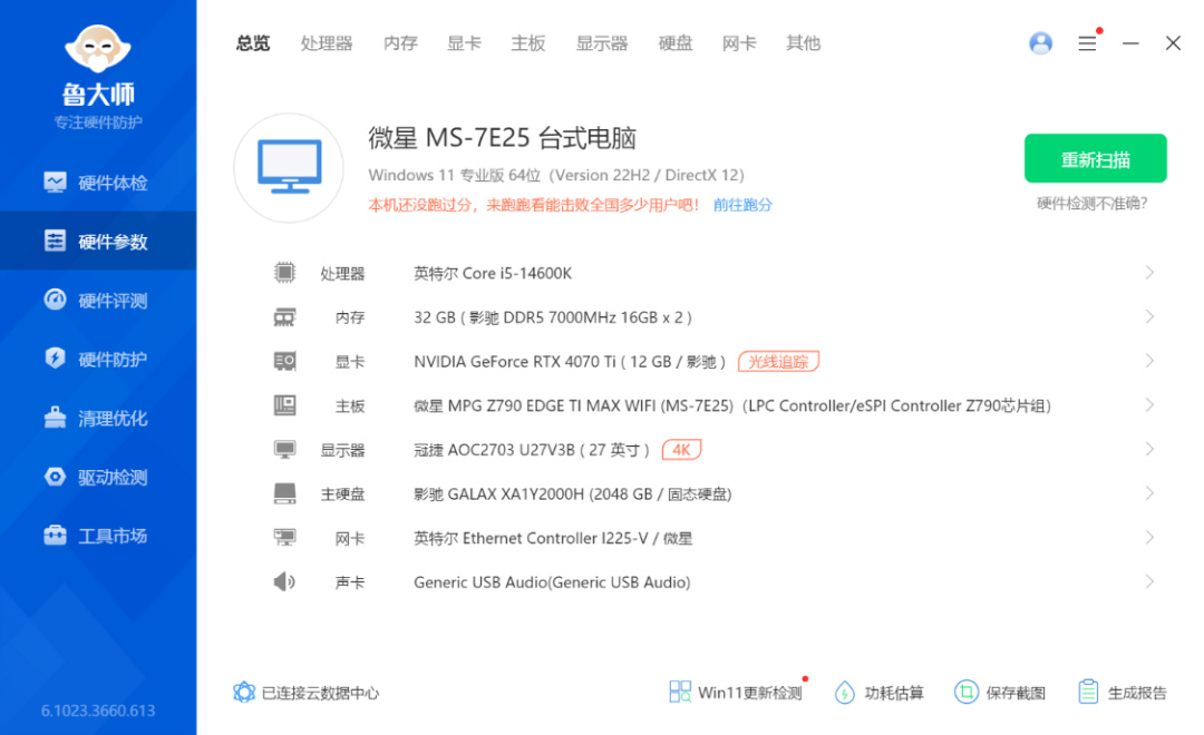 完整配置单:i5-14600K处理器、微星MPG Z790 EDGE TI MAX WIFI主板、影驰RTX 4070Ti 金属大师OC显卡、HOF Pro-7000MHz 16G*2 内存、星曜2T 20周年纪念版M.2固态、德商德静界Dark Rock Pro 5黑色风冷、德商德静界 Shadow Base 800 FX Black机箱、德商德静界Pure Power 12M 1000W金牌全模组电源...不用提醒我,70Ti super也要来了,毕竟还有那么久,咱就别杞人忧天了。等等党,永远不输性能。再说,这波嘎嘎乱杀的行情价,在super上复现,估计有点难度。