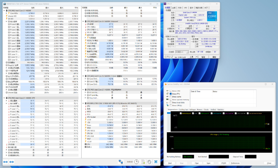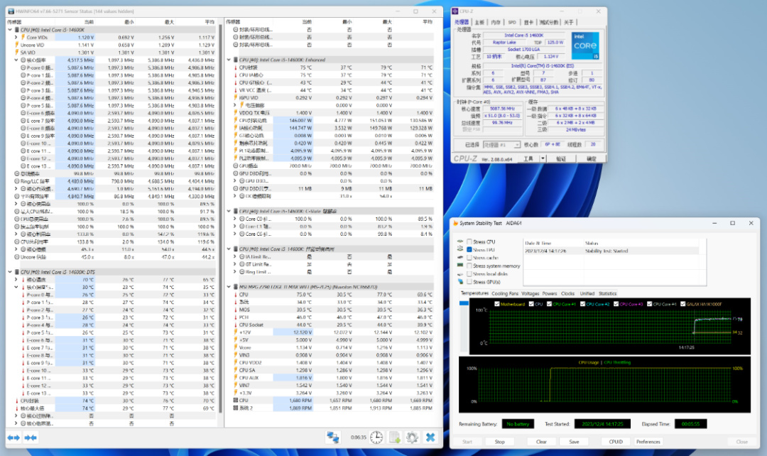 自动睿频状态下,电压自动,烤机5Min+,CPU温度为75°左右,CPU功耗为150W左右;