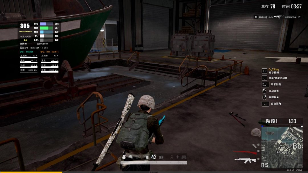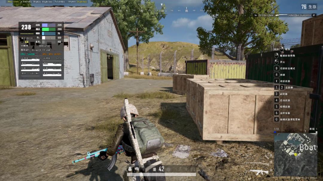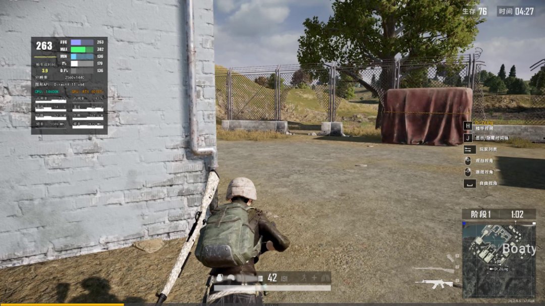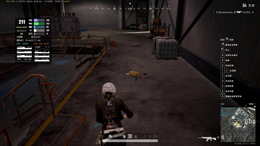 《PUBG·绝地求生》游戏中,三极致画质,渲染比例100%,图形API为DX11,4K分辨率下,游戏实际帧率为210FPS左右,大部分时间都保持在230FPS以上;