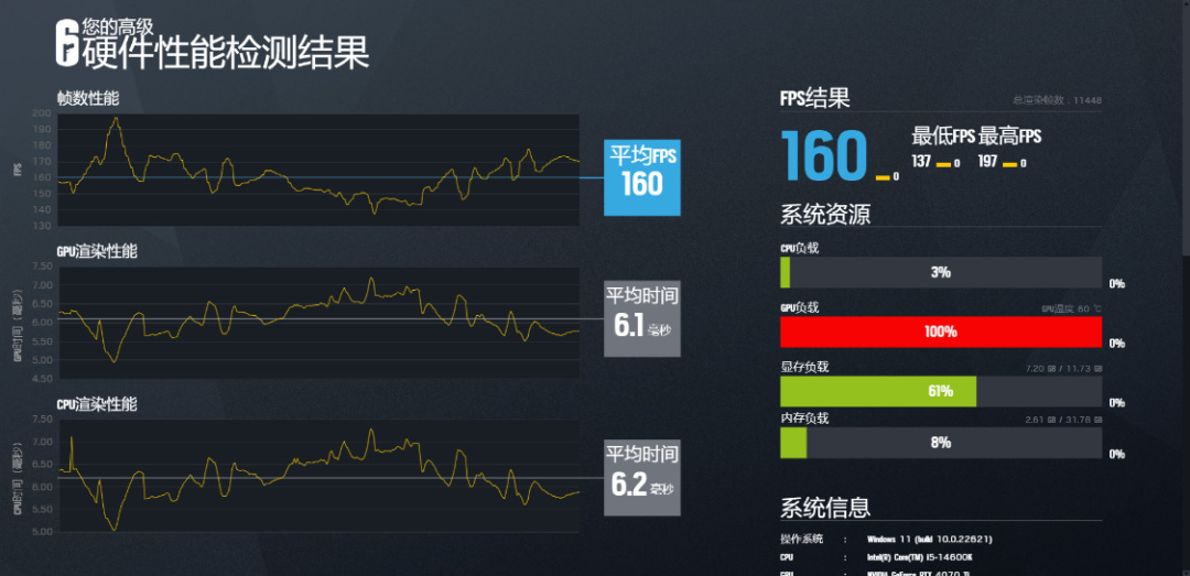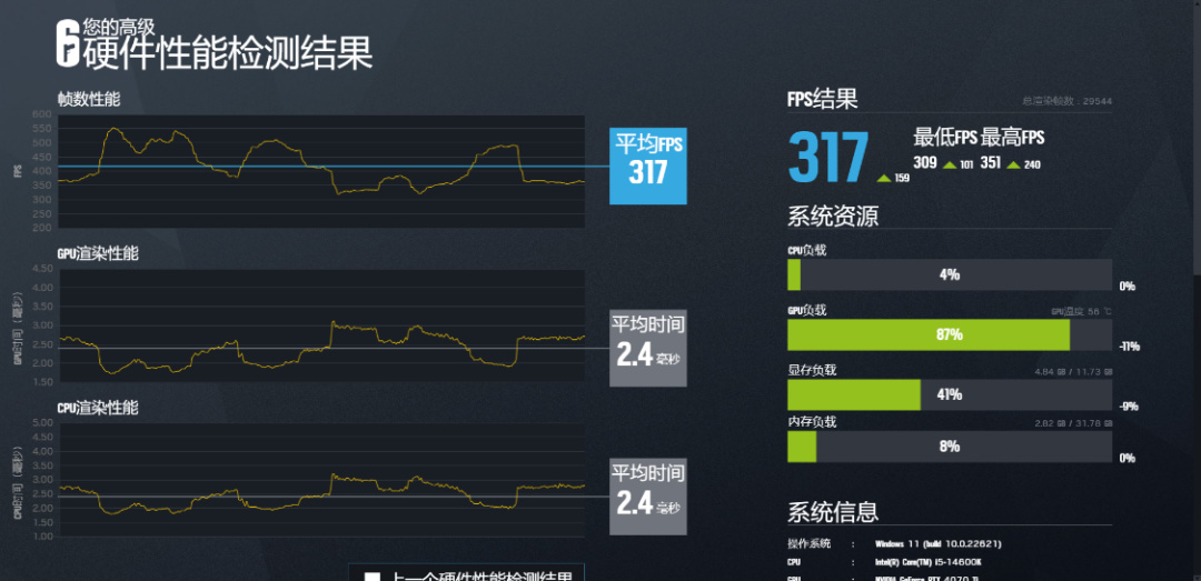 《彩虹六号·围攻》基准测试,画质超高,渲染倍率100%,4K分辨率下,游戏平均帧率为160FPS。2K分辨率下,游戏平均帧率为317FPS;