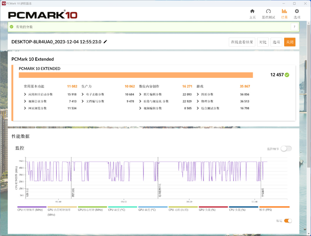 PC Mark Extended整机测试,整机得分12457分,常用基本功能得分11082分,生产力得分10062分,数为内容创作得分16271分,游戏得分35867分;