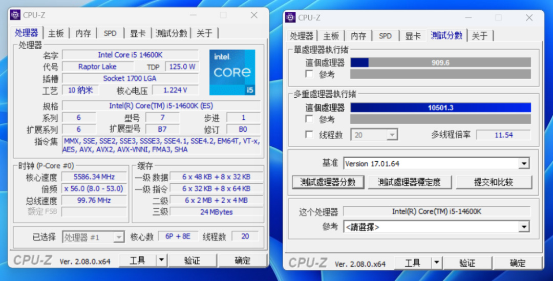 将处理器OC至全核5.6GHz后,单核得分909.6分,多核得分10501.3分;