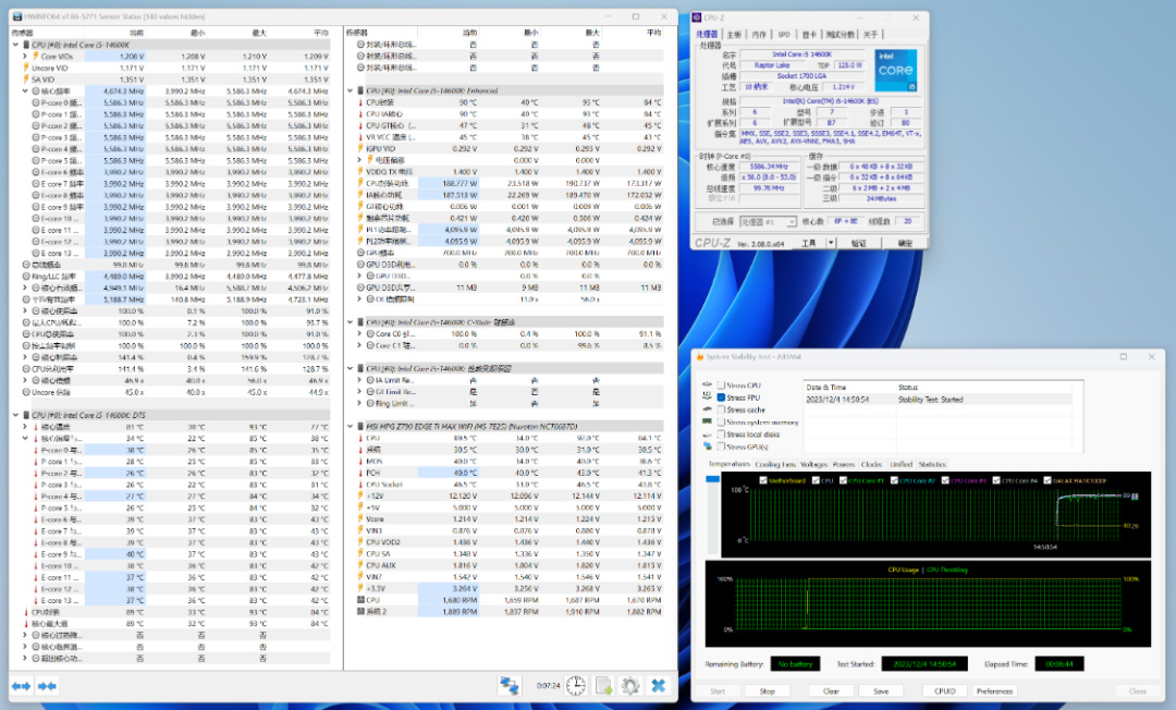 保持CPU为5.6GHz,手动将电压设为1.22v,再次烤机5Min,CPU温度为90°左右,CPU功耗为190W左右;