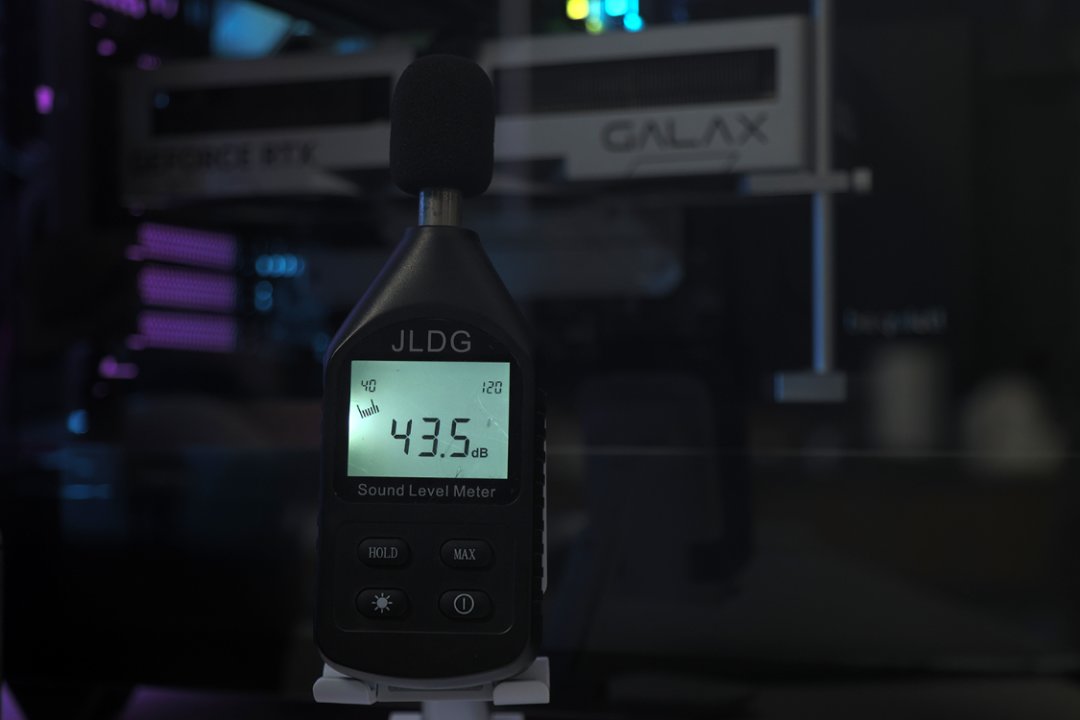 盖上机箱侧板时,机箱附近噪音为44分贝左右;