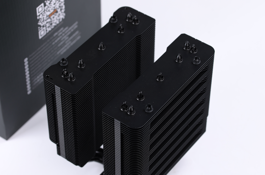 中置双塔设计塔体,全黑化处理,共搭载了90片铝合金材质散热鳍片,且所有鳍片均采用穿Fin + 折Fin的方式进行固定。塔体下方采用了内存避位处理,通过缩减部分散热塔体底部的鳍片宽度,从而提高对内存安装的兼容性。