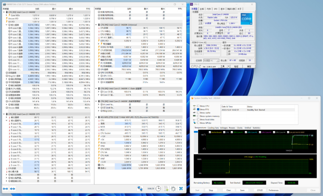继续将处理器OC至5.6GHz并解锁温度墙后,烤机5Min,CPU温度为98°左右,CPU功耗为220W左右;