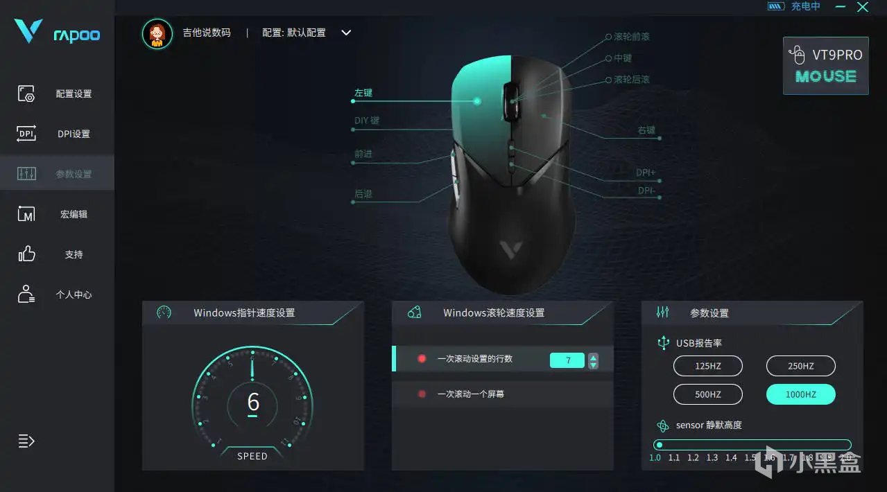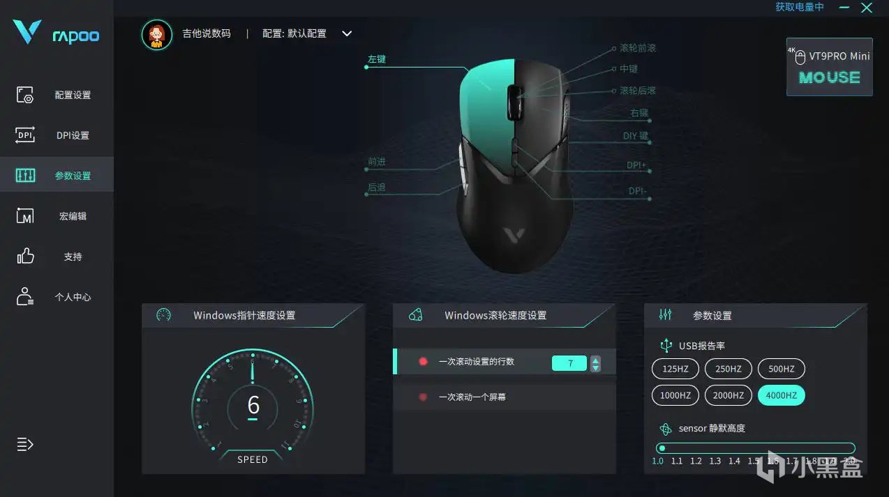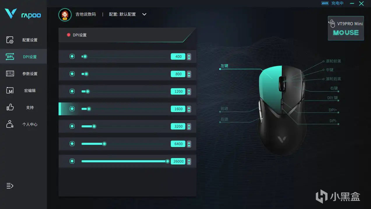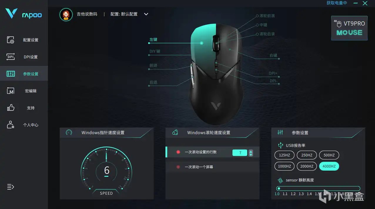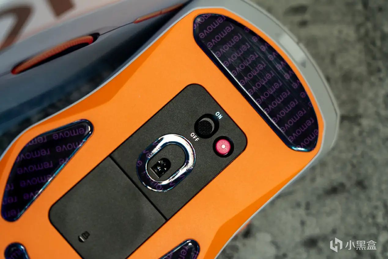 雷柏VT9PRO底部设计的这个红色DIY按键非常的有用,别看常规场景中基本用不到,但玩家可以在驱动里将其自定义为回报率切换或接收器切换功能,瞬间实用性大增。