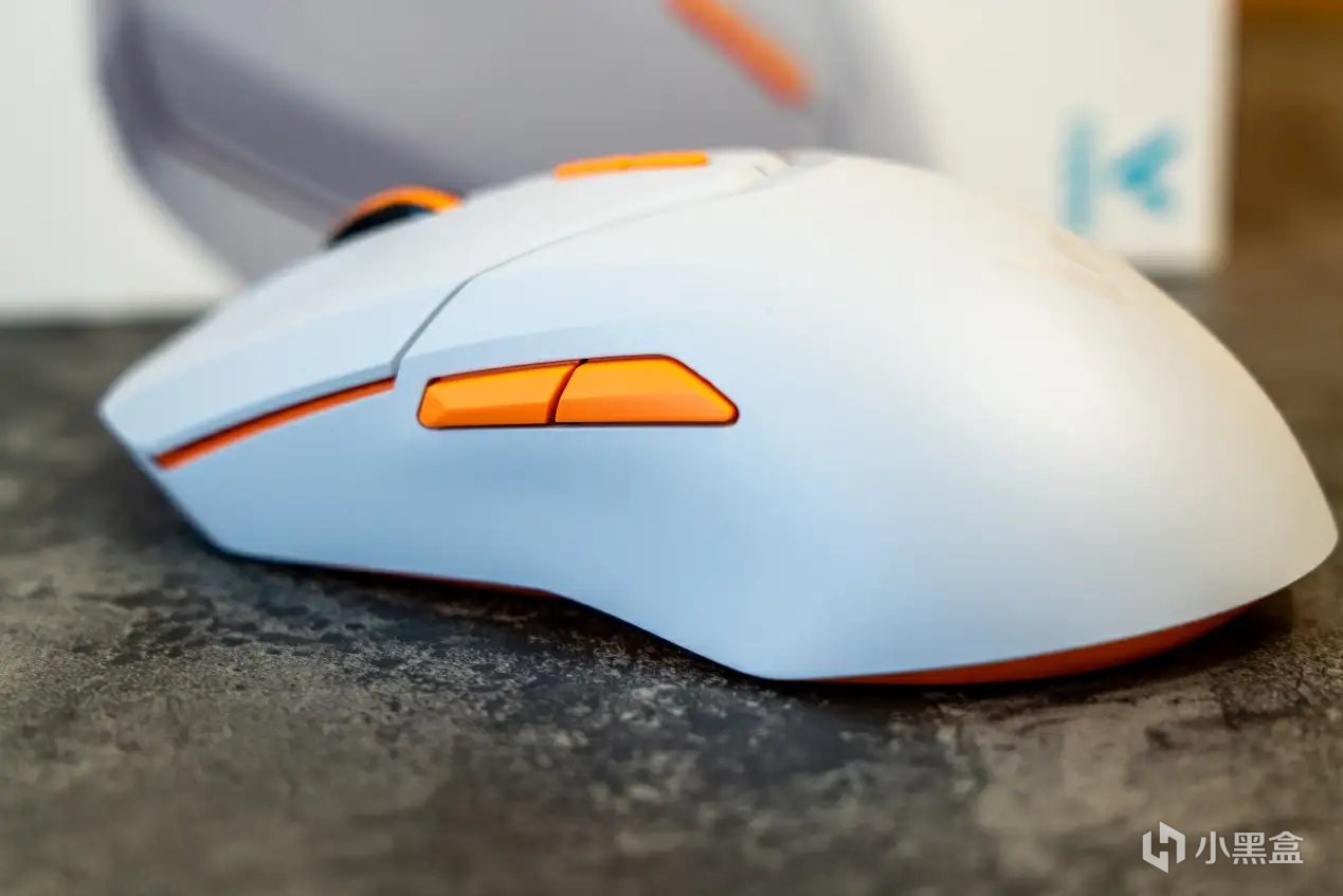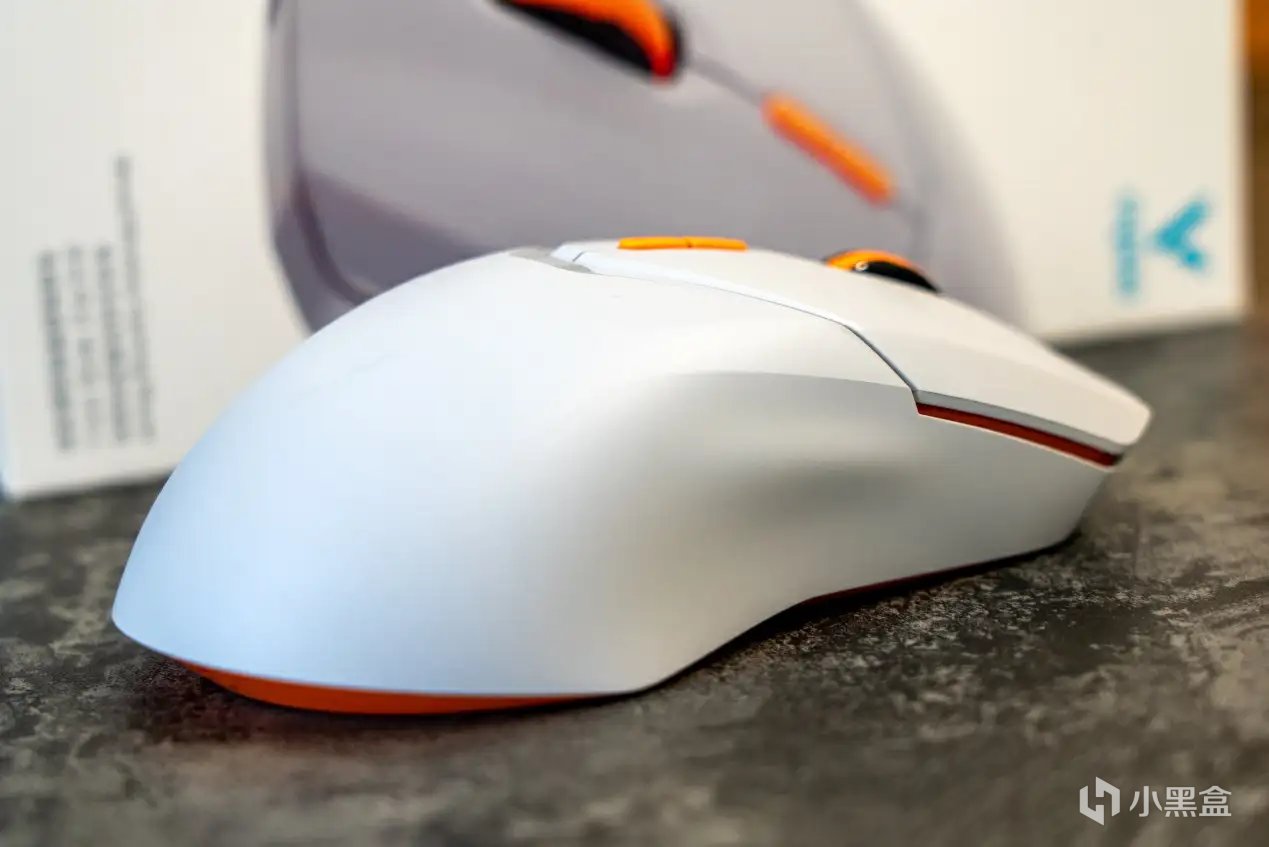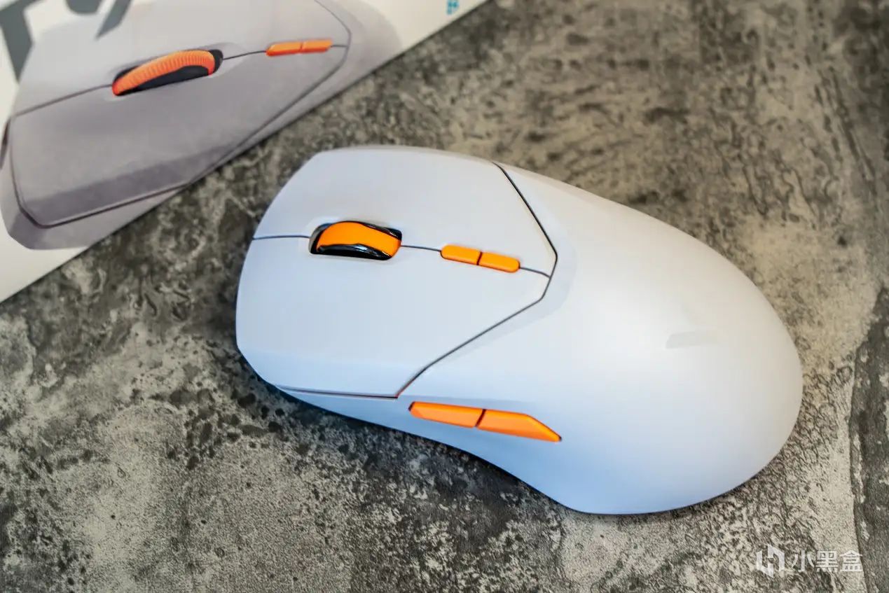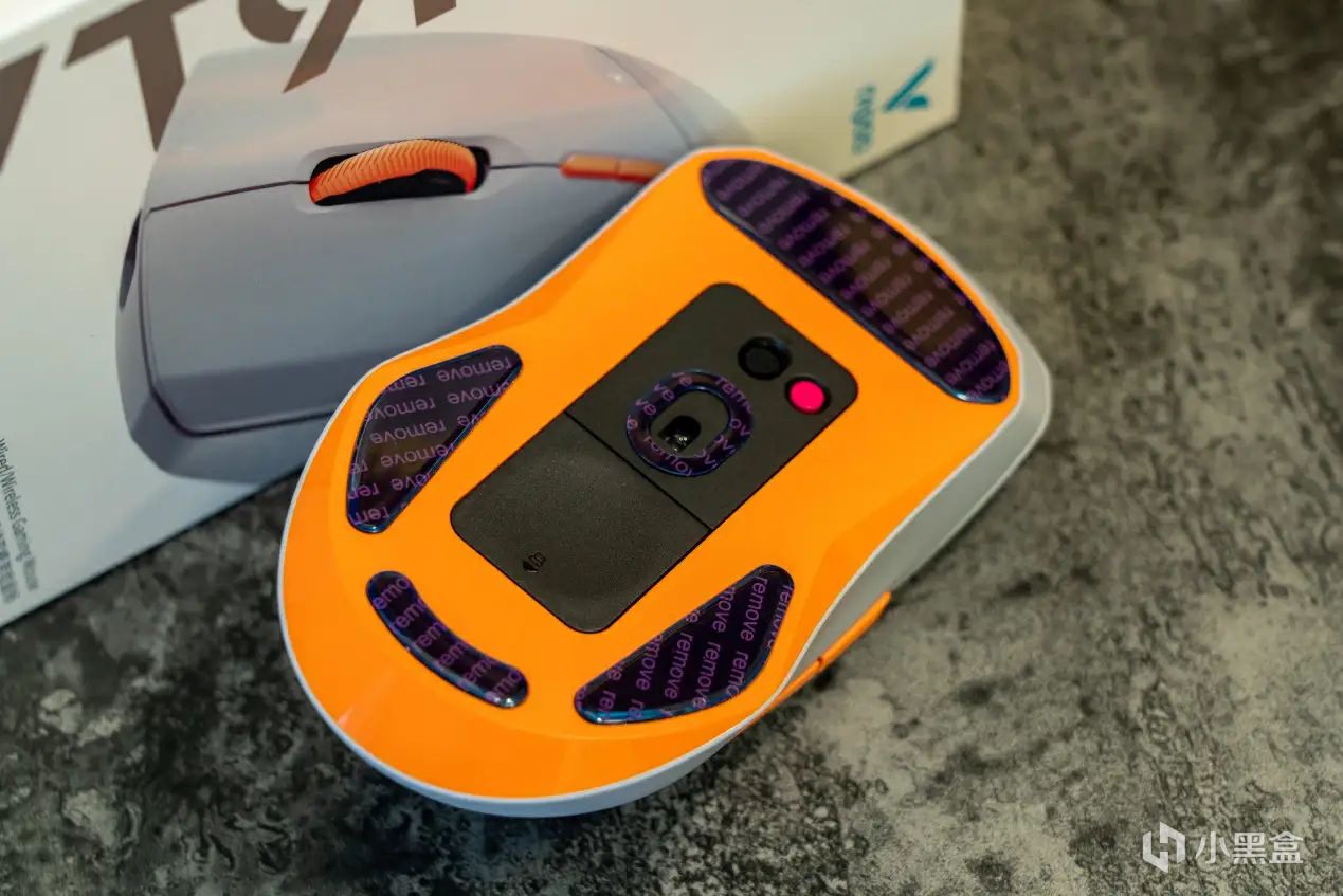 先来说说雷柏VT9PRO,可能是这款鼠标太受欢迎了,雷柏目前总共提供了七款配色可以选,笔者手上的是浅灰版本。鼠标正面大部分区域均为浅灰细腻磨砂设计,而滚轮、DPI切换按键以及两个侧键则采用了亮橙色进行点缀,打破了浅灰色容易带来的沉闷感,整体电竞范儿还是挺强的。事实上这种灰橙的搭配可以称得上是键鼠领域中比较经典的颜色组合了,看起来低调又不失活力感,不少键鼠玩家都挺喜欢的。