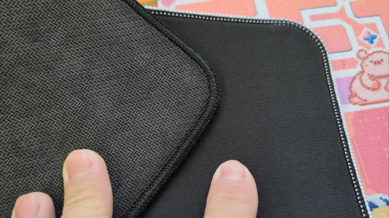 垫子的表面呢采用了粗面乱纹,表面的颗粒感很强,十分密集,且因为这种设计可以使x轴和y轴的手感相同,并且也因为如此,鼠标底部所摩擦的面积大大减少,在使用中会更加丝滑。