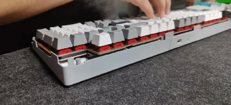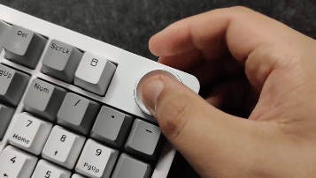 而这把青龙的传统gasket,加上没有开槽的PCB和定位板在手感一致性方面要出色的多,而且我再也不用担心我的轴体按不下去了,可以在下图看到我在敲击字母区的时候,键盘边缘的旋钮区也是完全跟着下沉。