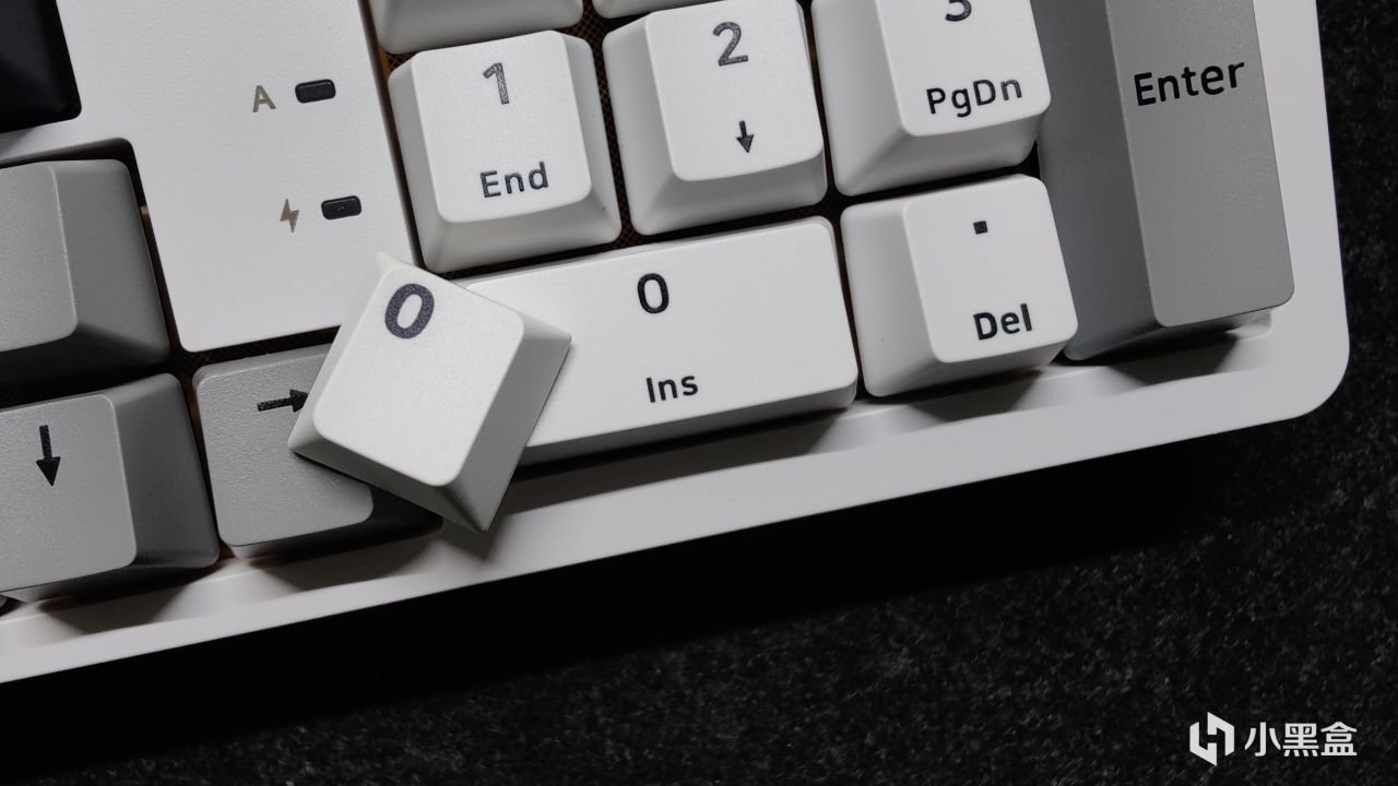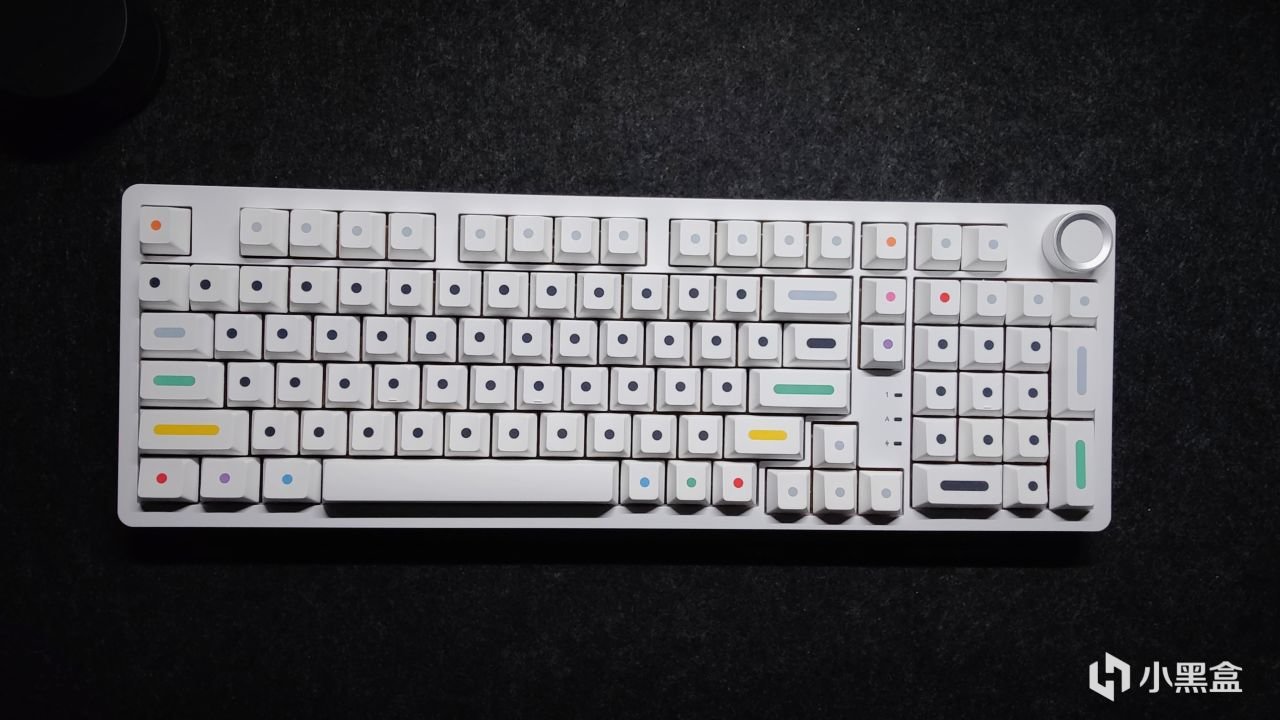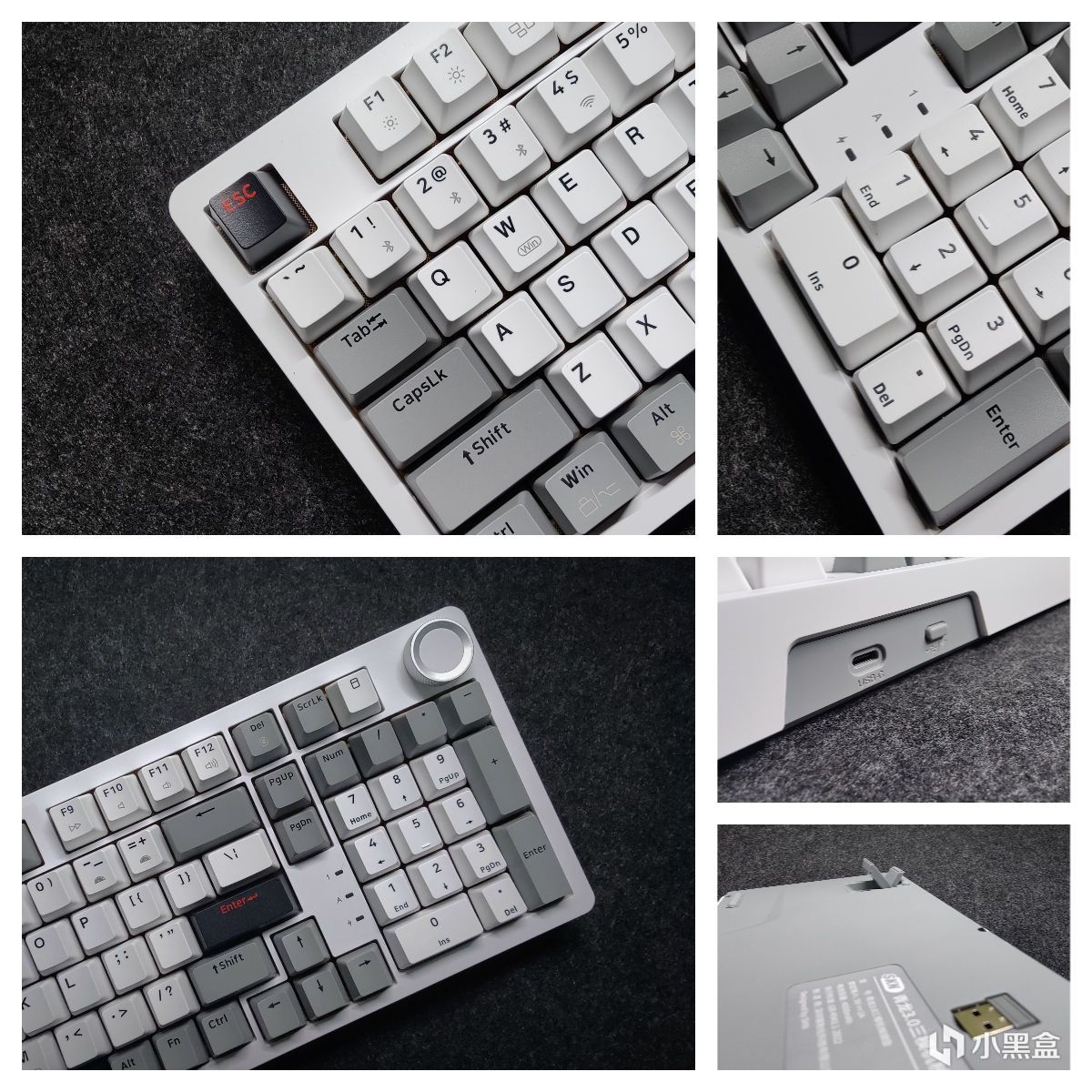 黑白灰三色键帽+右上角的双色旋钮+实用的2u0设计+一键呼出计算器(默认)+顶部无线开关+电源口+两段式脚撑+2.4g接收器收纳。