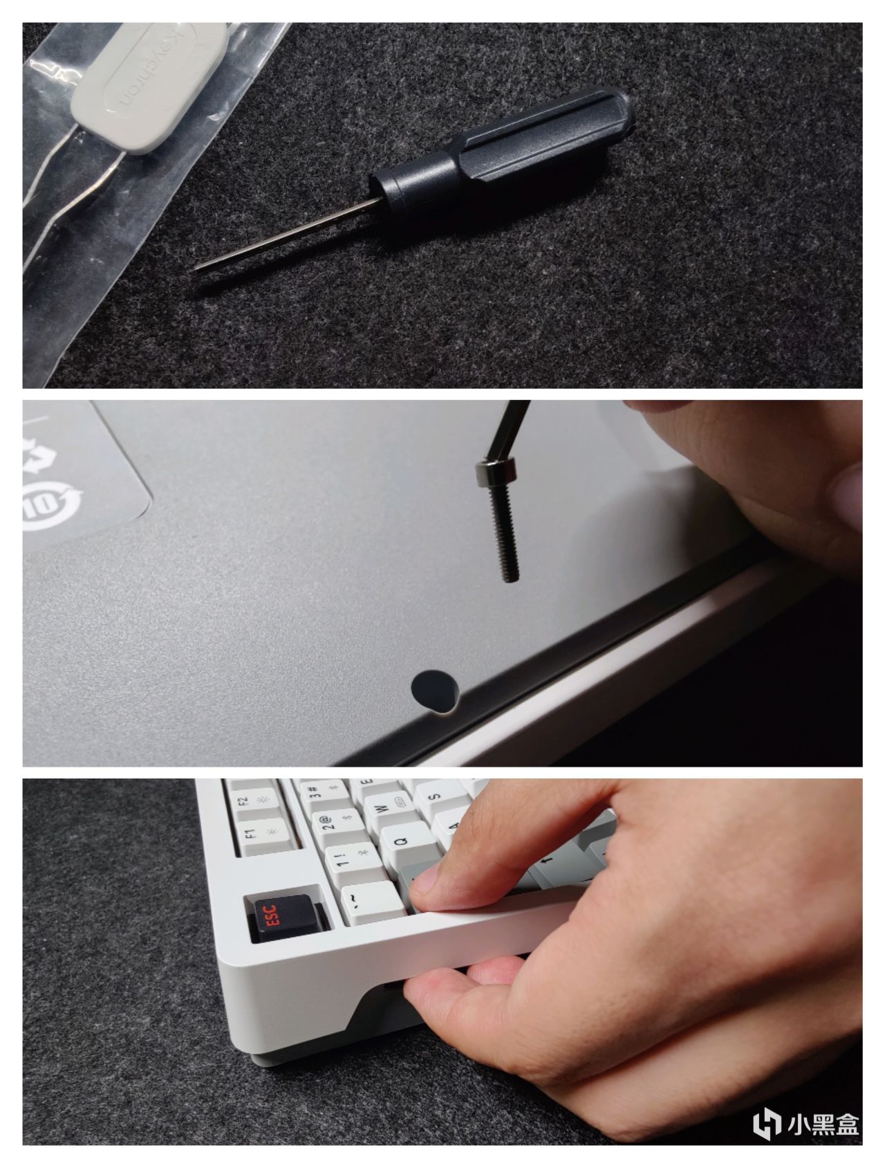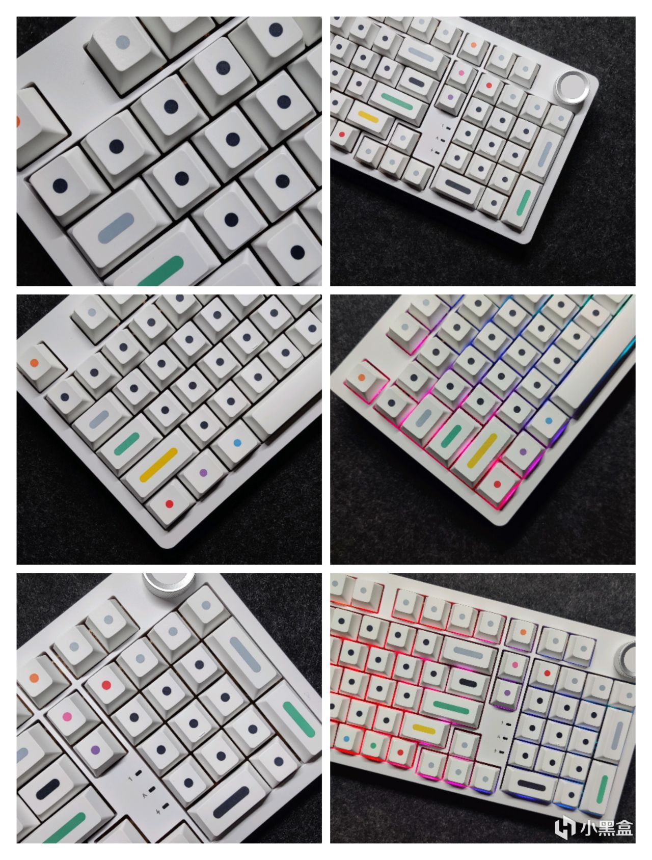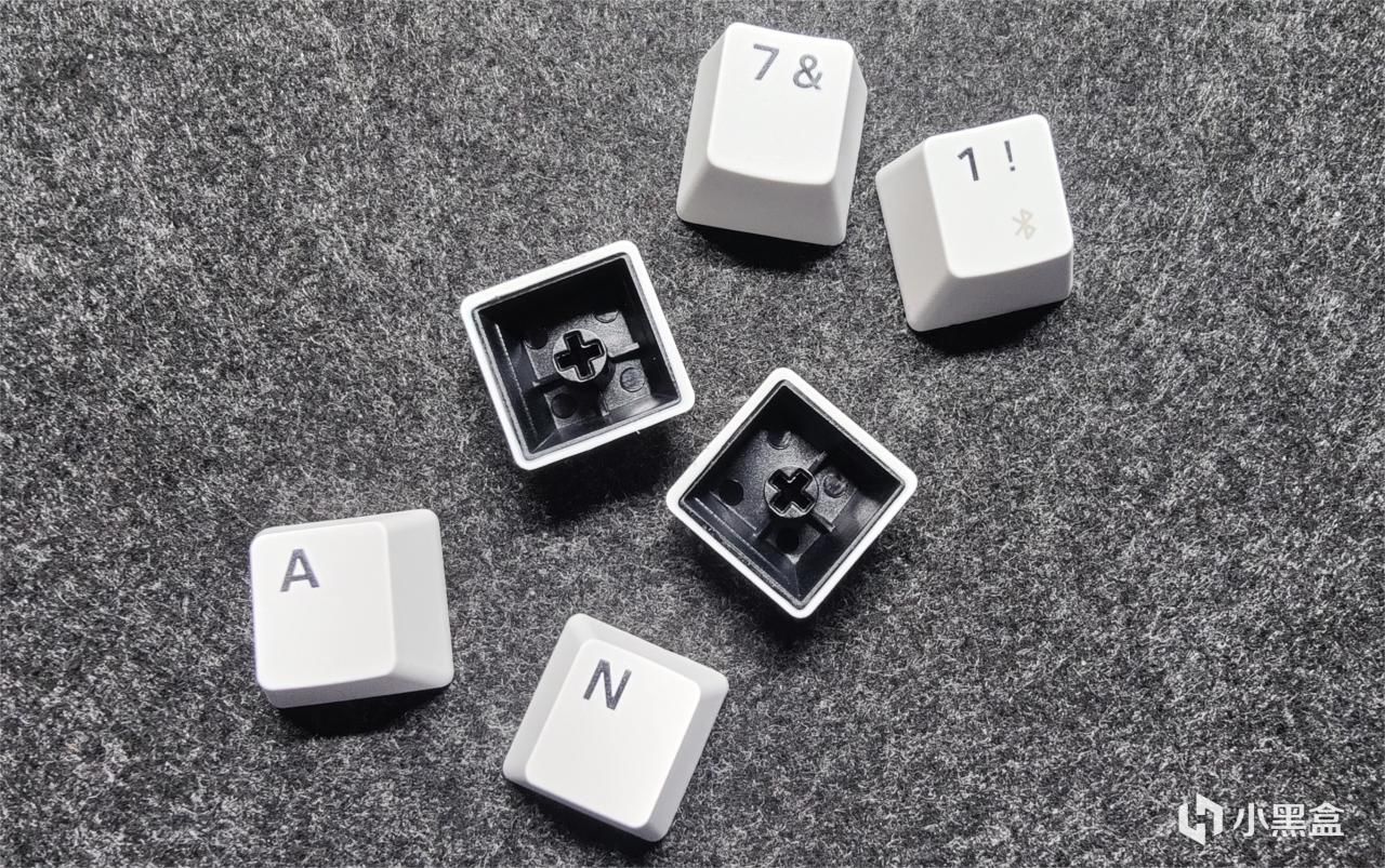 黑白灰三色键帽+右上角的双色旋钮+实用的2u0设计+一键呼出计算器(默认)+顶部无线开关+电源口+两段式脚撑+2.4g接收器收纳。