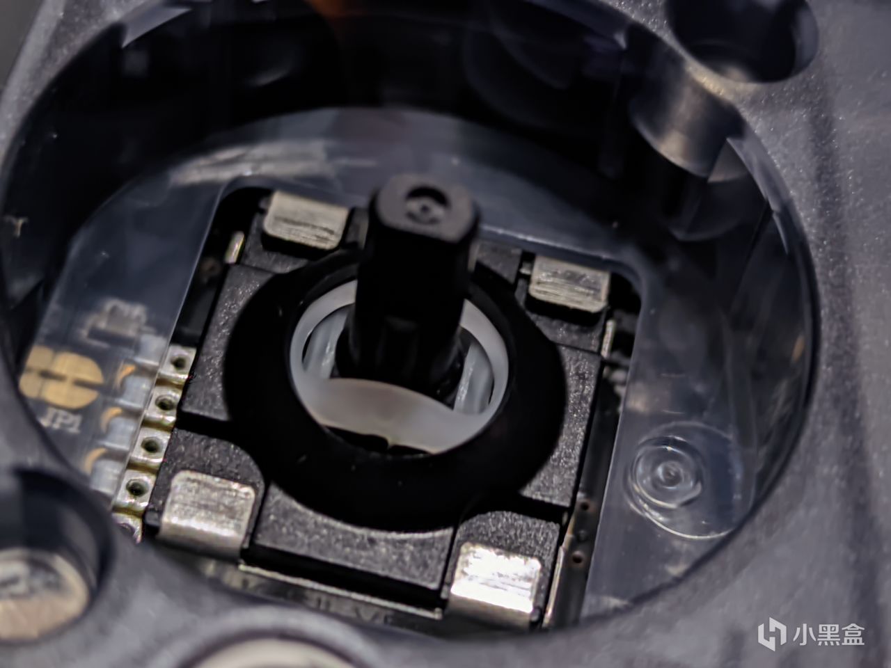 得益于其本身的半透明设计以及可拆卸面盖,我们可以比较清楚的看到这颗霍尔摇杆的外貌,看起来还是很漂亮的,不过在正对着我们的部分没有显示盖世小鸡的字样,所以不确定是通版还是定制了。