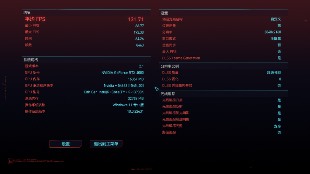 《赛博朋克2077》基准测试,画质超级,开启DLSS 3.0并设为超级性能模式,光追设为变态,4K分辨率下,游戏平均帧率131.71FPS。