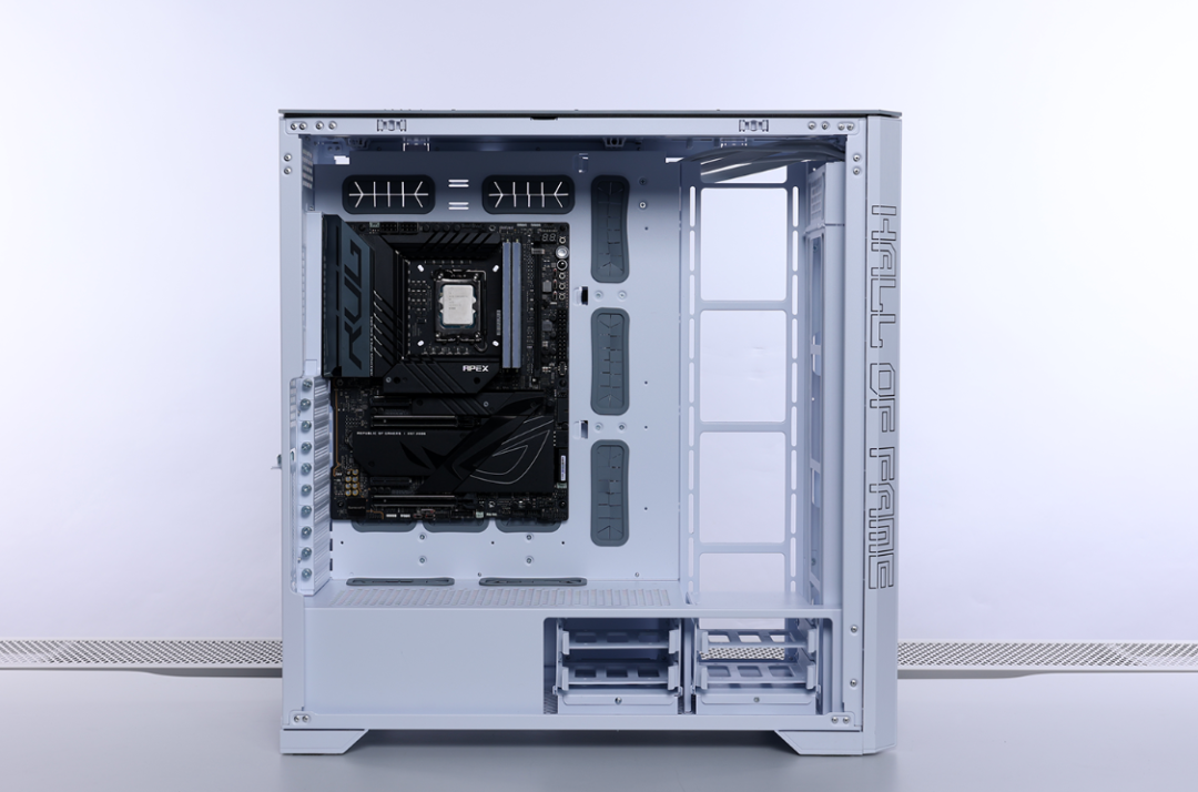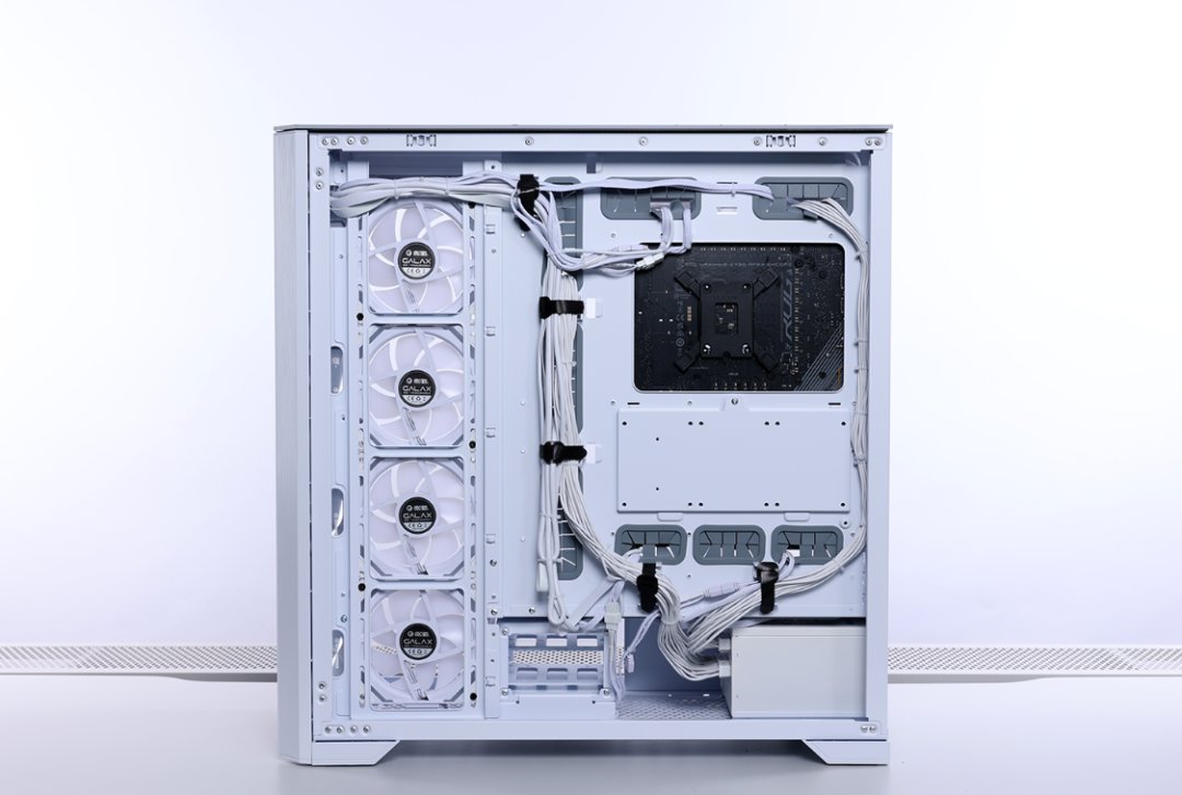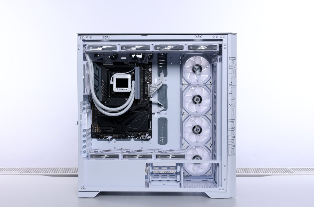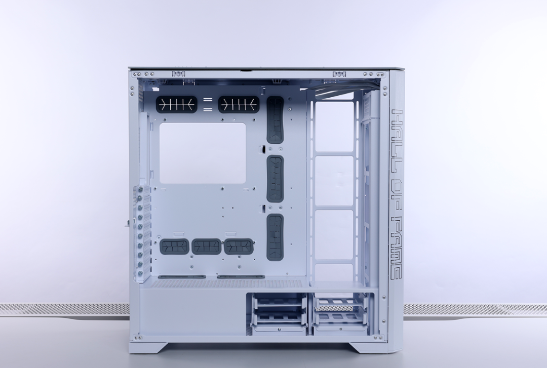 兼容性方面,机箱最大支持SSI-EEB/EATX规格主板,并配备了10横+3竖PCIE拓展槽,支持安装长度在485mm内的显卡。散热方面,机箱最大可安装16把120mm散热风扇,风冷散热限高200mm,顶/侧置最大支持安装480水冷,顶/侧/前置也能兼容420水冷安装。