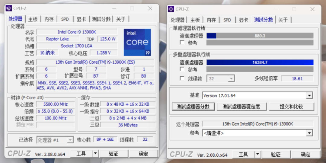 CPU-Z基准测试,单核得分880.3分,多核得分16384.7分;