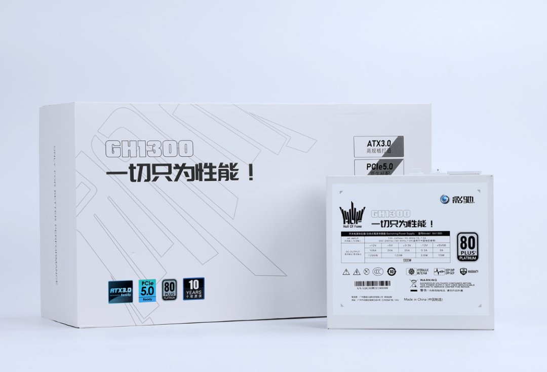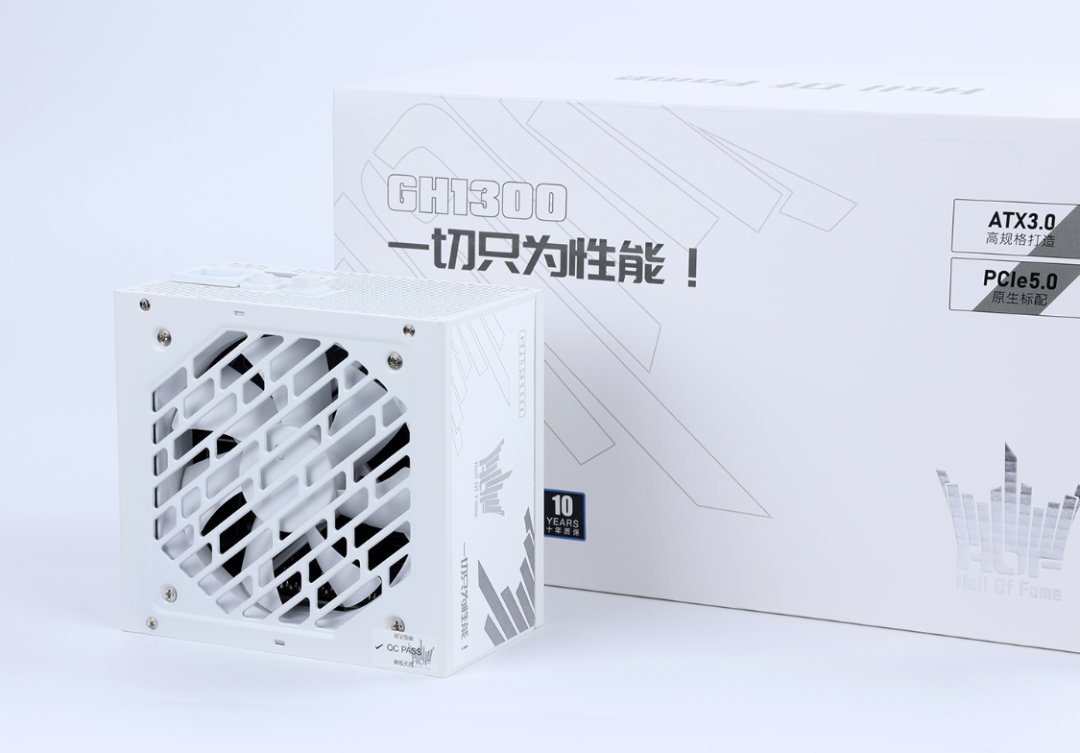 没有省预算的必要,电源当然也得直接拉满,一颗支持PCIE 5.0和ATX3.0的影驰HOF GH1300白金牌全模组电源,安排。电源采用全日系电容豪华配置,内置一颗12CM纯白静音风扇,并支持支持智能启停功能。提供2个原生支持PCIE 5.0标准的12VHPWR显卡供电接口,单线最高可以提供600W的供电能力,可以完美满足顶级RTX40系显卡的双12VHPWR接口供电需求。