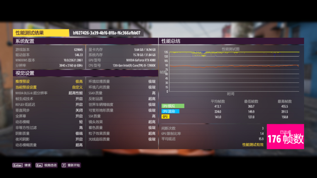 《极限竞速·地平线5》基准测试,极端画质,极端光追,DLSS超级性能,并开启DLSS 3.0,4K分辨率下,游戏平均帧率为176FPS;