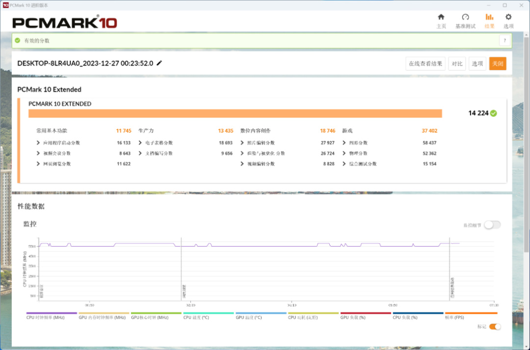 PC Mark Extended整机测试,整机得分14224分,常用基本功能得分11745分,生产力得分13435分,数为内容创作得分18746分,游戏得分37402分;