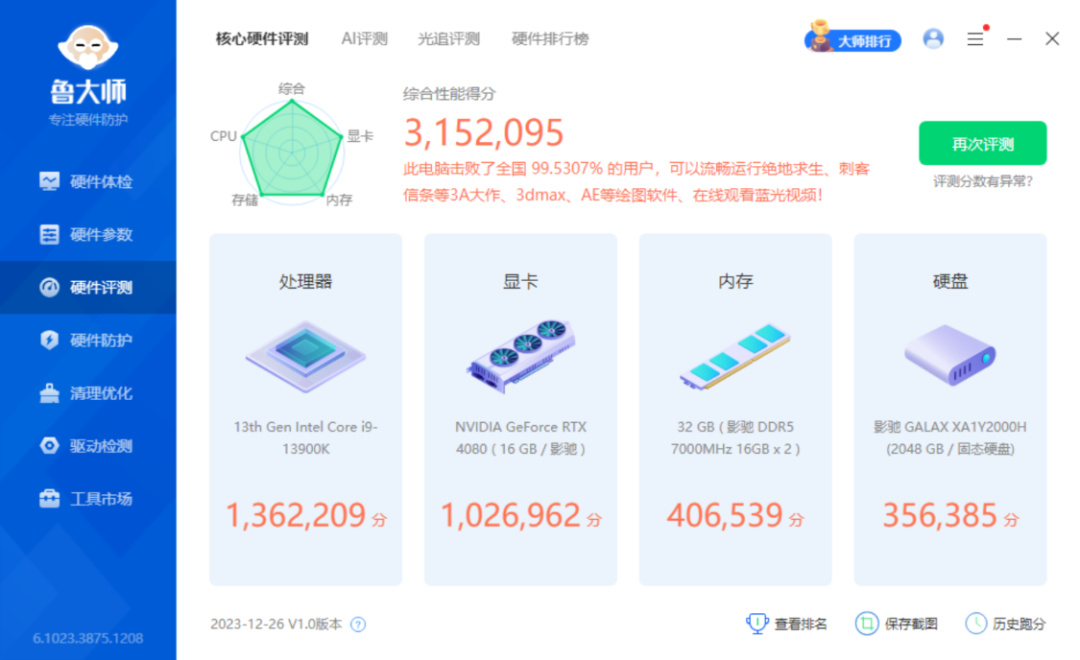 配置拉满,性能自然也能顶流。鲁大师整机测试得分315W分;