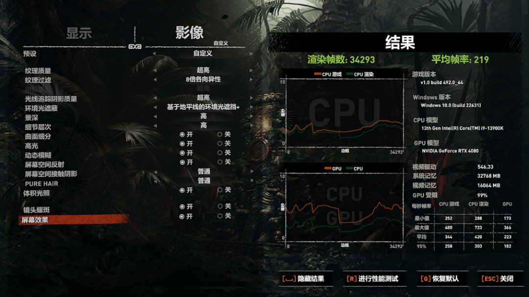 《古墓丽影》基准测试,最高画质,超高光追,DLSS设为超强性能,4K分辨率下,游戏平均帧率为219FPS;