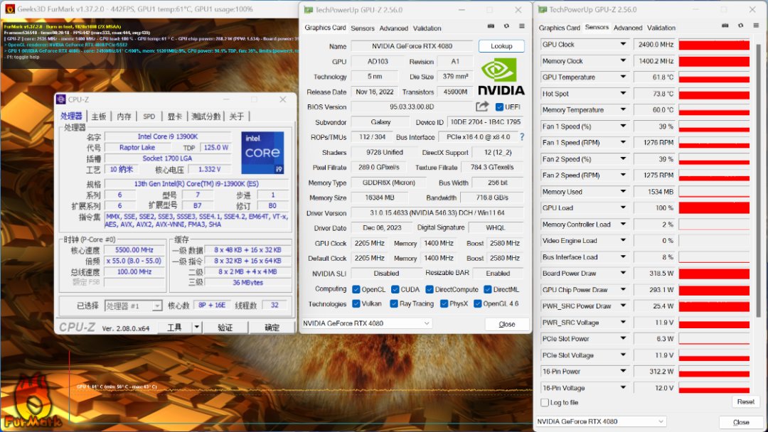 FurMark烤机测试,机箱内环境,烤机20Min,显卡温度62°左右,显卡功耗320W左右;