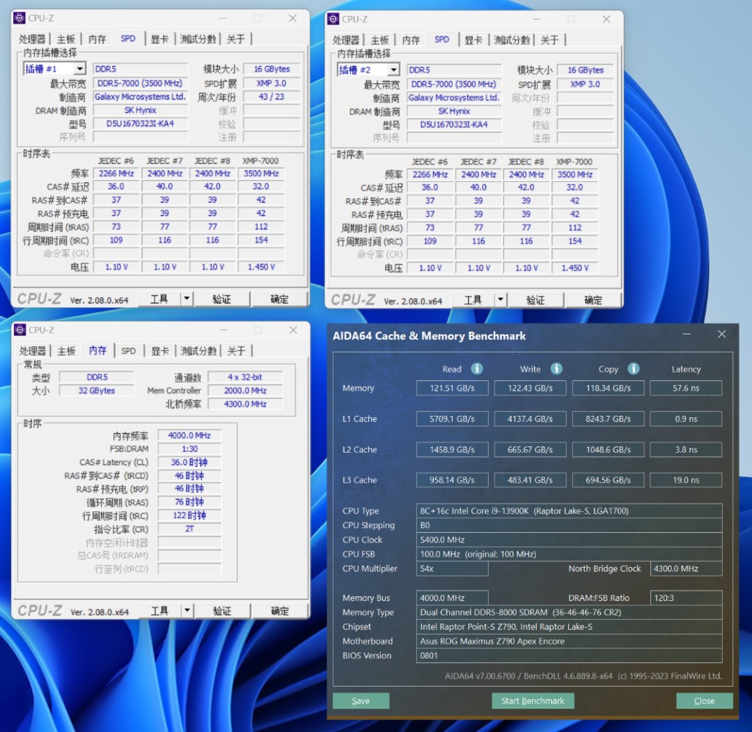 手动OC至8000MHz,内存读取速度为121.51 GB/s,写入速度为122.43 GB/s,复制速度为118.34 MB/s,延时为57.5ns;