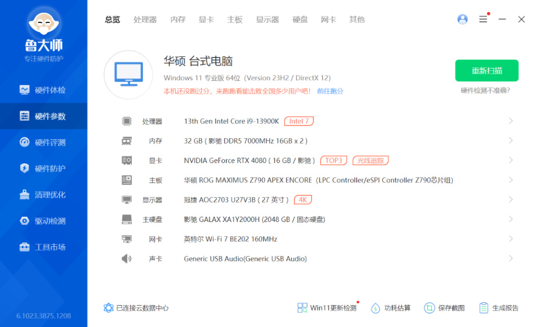 完整配置清单:i9-13900K处理器、华硕ROG Z790 Apex主板、影驰RTX4080星曜OC 显卡、HOF Pro D5-7000Mhz 16G*2内存、星曜 2T 20周年纪念版固态硬盘、G480星曜水冷散热、HOF OC ONE-星曜娘定制版全塔机箱、HOF GH-1300白金牌全模组电源、铠F3星曜积木风扇白色版*12...别急着喷,显卡是借朋友的,咱等4090D。至于整机预算,即便不带显卡,应该也在1.4W左右了。别急着喷,这是咱自己用的。换14900K的话,大抵也就加个三五百就好。当然,你还得多找几个抖音号去下单才行。