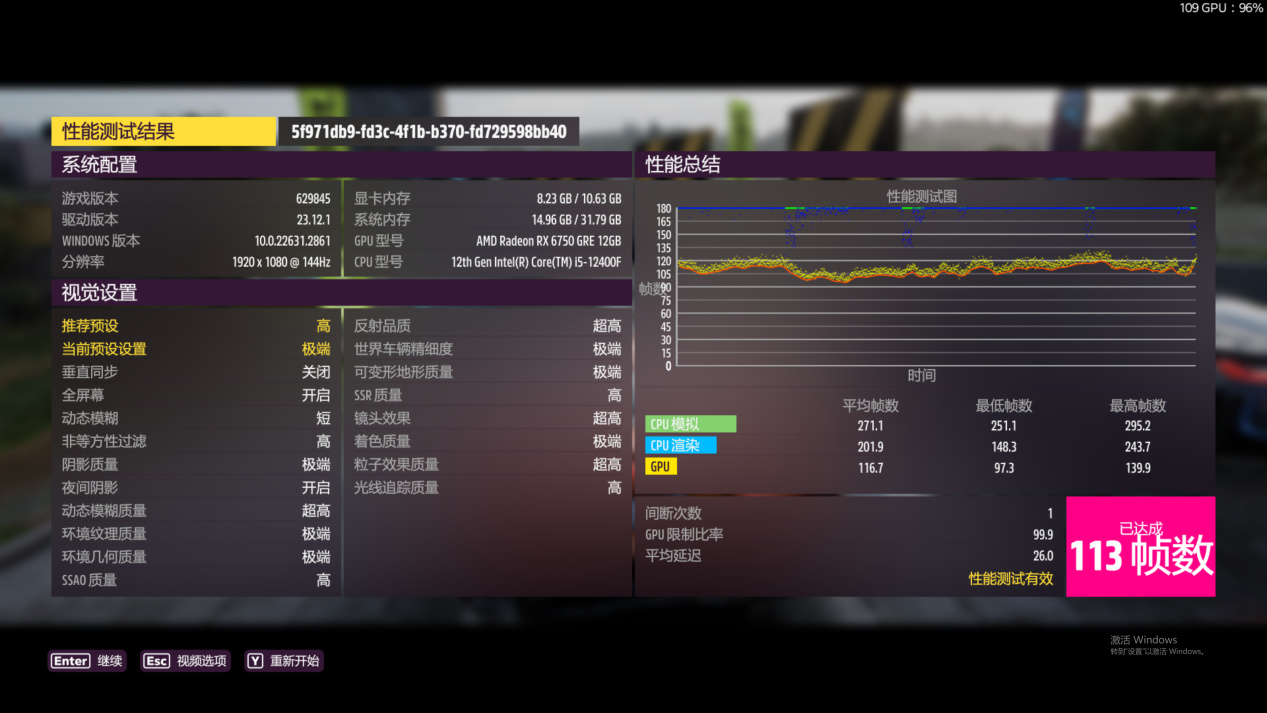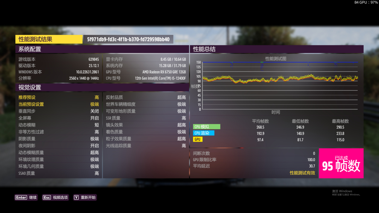 在极限竞速:地平线5这款热门的赛车游戏中,1080P预设最高画质平均113帧,2K预设最高画质平均95帧,都可以流畅运行。