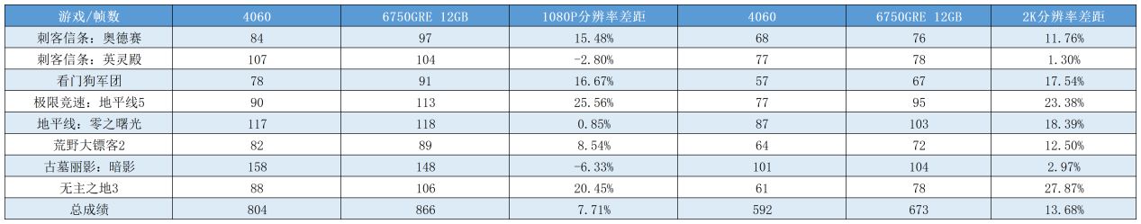 从价格来说,6750GRE 12GB目前2000出头,同价位能买到的其他新卡就是4060,但是6750GRE的性能却实打实的领先4060不少,简单来说就是可以用4060的价格买到4060Ti的性能。