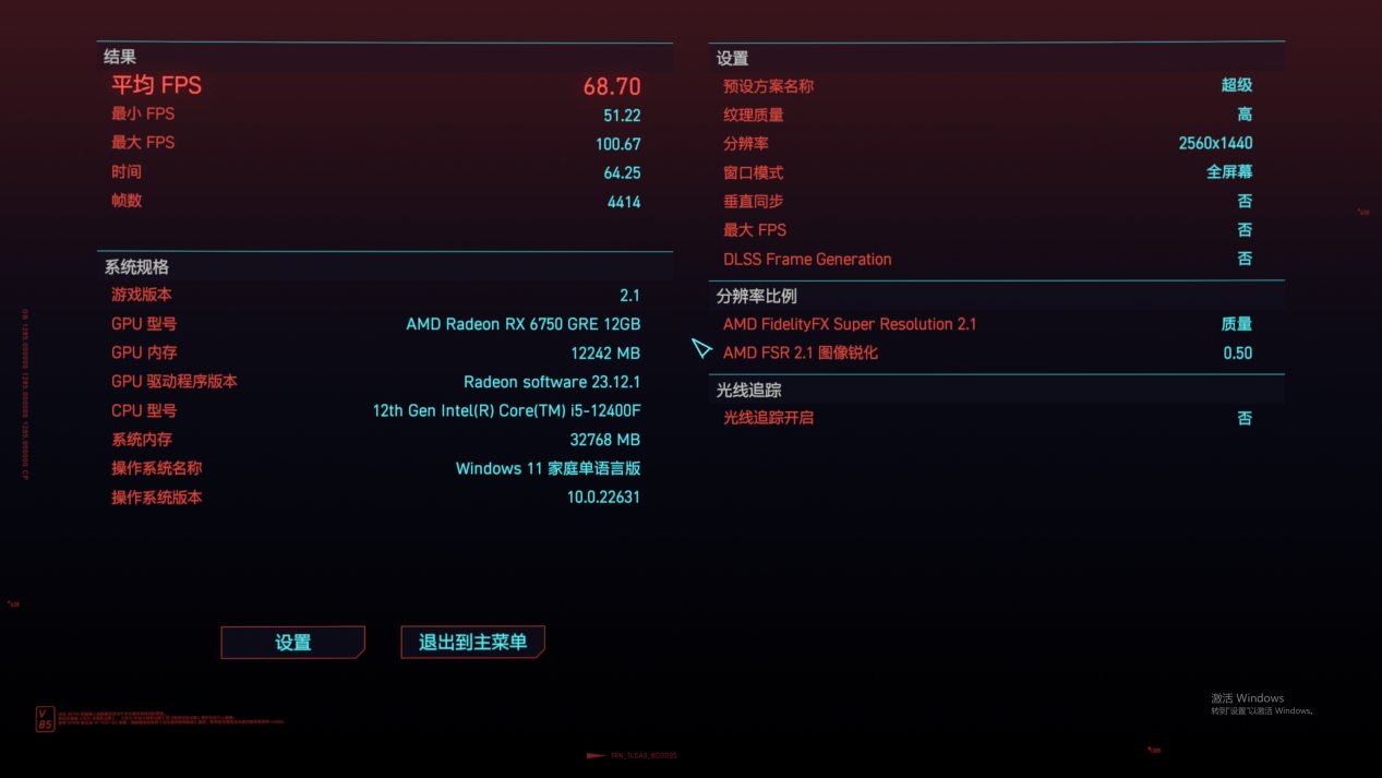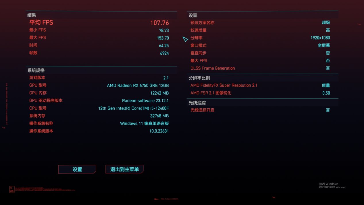 而在被称为显卡杀手的赛博朋克2077这款游戏中,1080P预设超级画质平均108帧,2K预设超级画质平均69帧,这应该要得益于AMD的FSR,在预设超级画质中FSR就会自动开启,在FSR的加持下,2K分辨率最高画质也能流畅运行。