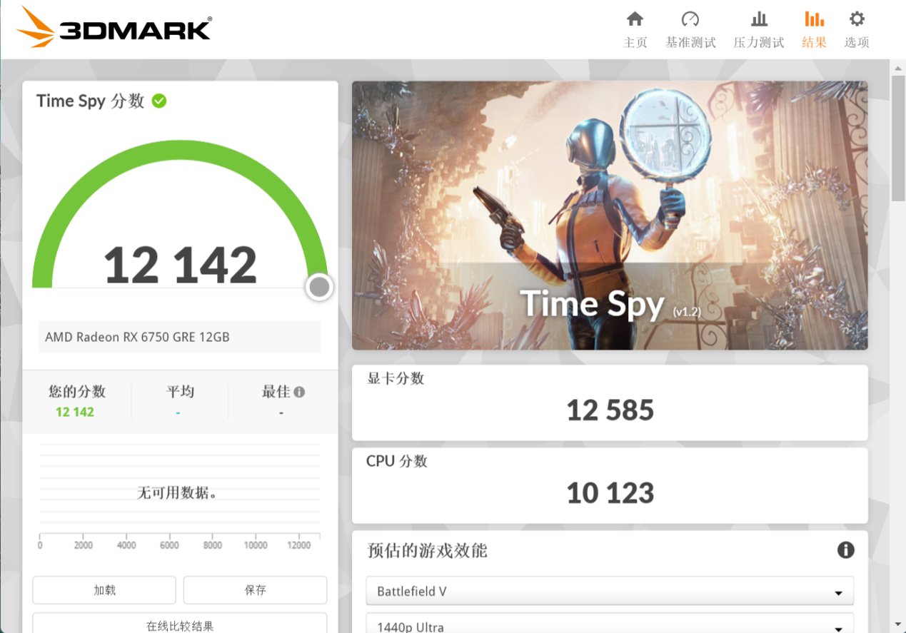 3DMark Time Spy跑分成绩12585,作为性能对比参考,4060的跑分成绩大概是10600左右,6750GRE 12GB的Time Spy跑分成绩要比4060强15%以上。