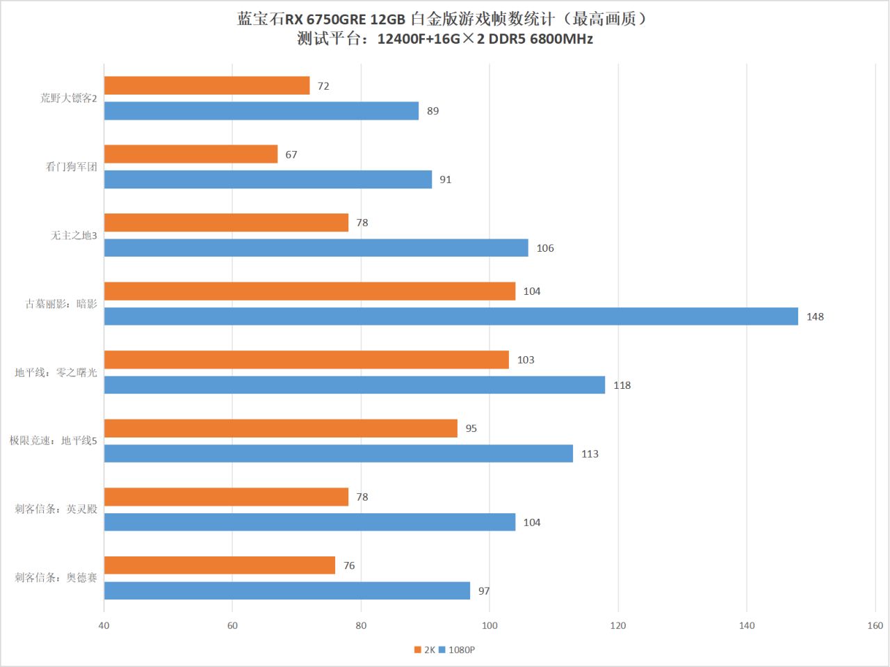 在经典的刺客信条奥德赛、英灵殿这两款3A大作中,RX 6750GRE在1080P分辨率下最高画质都有百帧左右的成绩,2K分辨率下也能接近80帧水平,游戏性能相当强悍。