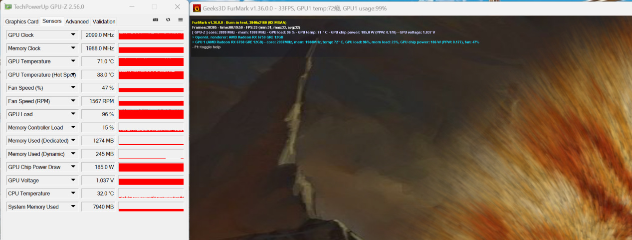 蓝宝石6750GRE白金散热模组采用了4热管设计,单烤甜甜圈20分钟,显卡温度71℃,热点温度88℃,温度表现还是挺不错的,这张卡的功耗185W,官方推荐的电源功率为650W,实际上搭配i5级别的CPU电源功率550W就足够了。