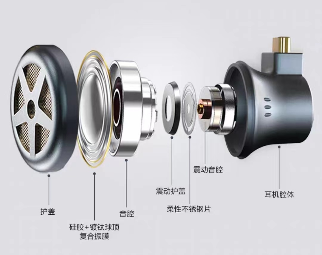 CVJ柒的另一个大亮点在于震动单元。个人能力有限,没办法拆机。通过下面这方官方设计图,我们能够看到在发声单元的最里面,搭载了一个创新性震动音腔。震动单元采用了精密的工程设计,根据游戏内音效实时同步震动,带来更具沉浸感的游戏体验。
