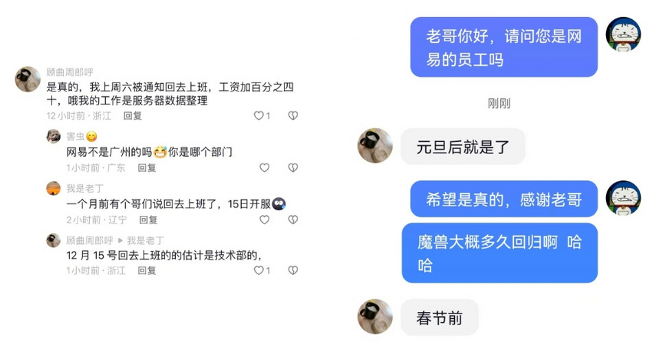 有网友发布了与疑似网易员工的截图,声称为了暴雪游戏回归国内,一些之前被优化的员工接到了通知,收到了召回令,元旦开始上班,甚至工资涨幅高达40%。传言称魔兽世界等暴雪游戏将在今年春节前后再次开启服务器,引发了玩家们的热切期待。