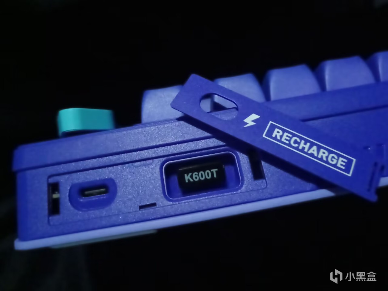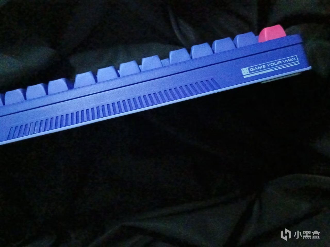 Type-C接口布置在了键盘后侧方的左侧,并且周围是一个卡扣式的收纳仓盖,打开之后就看到2.4g接收器了,后侧方中间位置是对称的斜竖条纹,右侧是装饰字样,内容是“GAME YOUR WAY”,我个人比较喜欢这一块,简约。