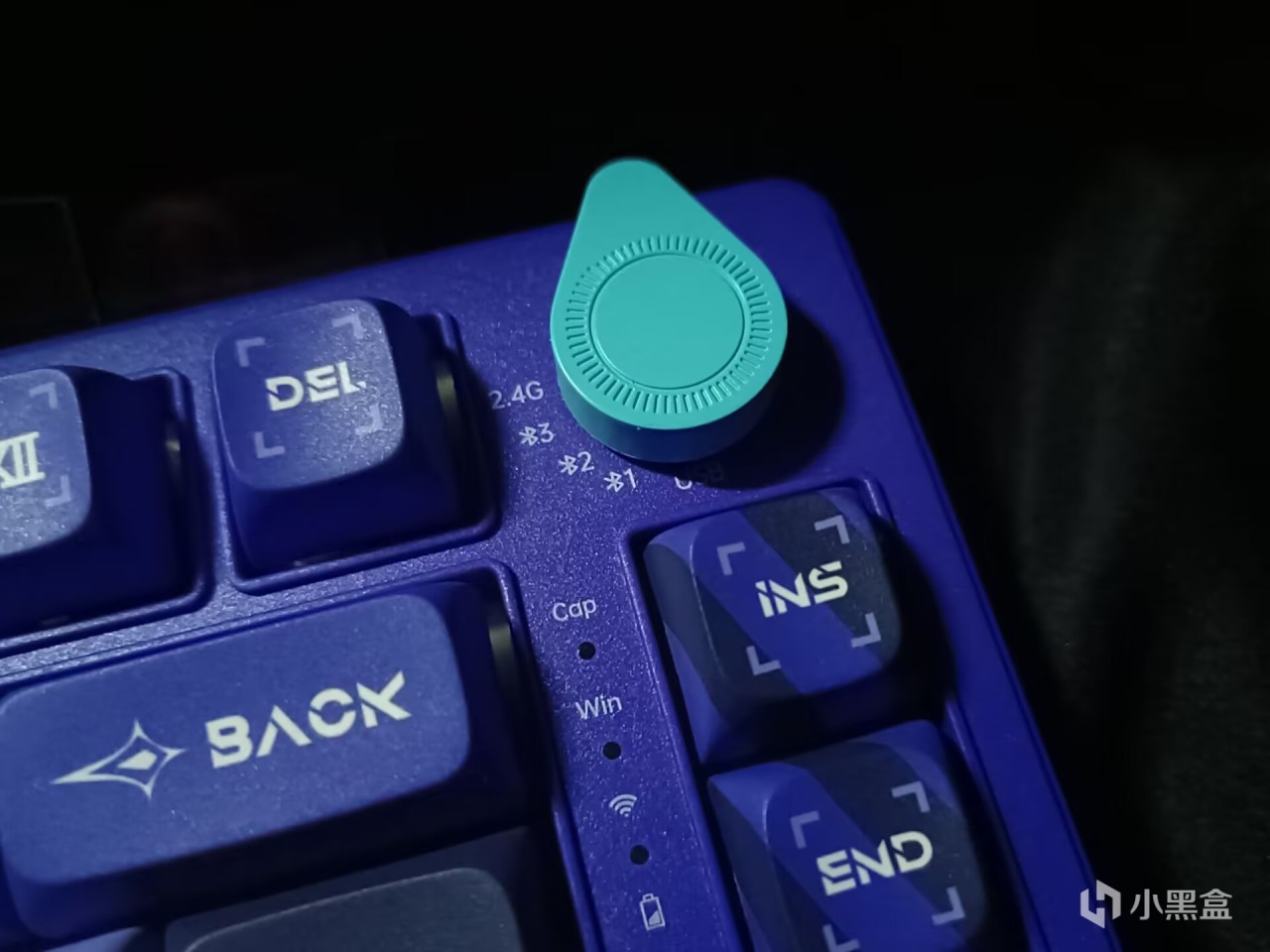 指示灯方面,这款键盘是放置在了最右侧那一列功能键的左侧,除了大小写指示灯、win键锁定指示灯和无线连接指示灯外还增加了一个电量指示灯,没有做遮光处理,背光关闭状态下可以看到漏光,开启背光时就不太明显,最暗的两个档位隐约可见,其他档位基本看不到。