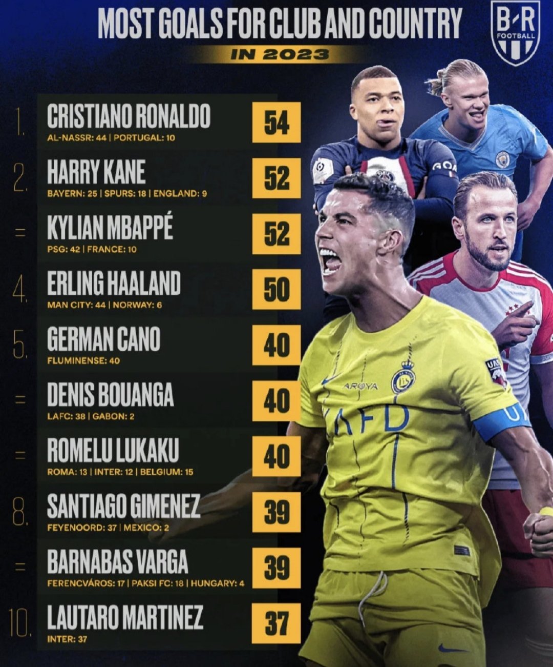 1.C羅:54球(利雅得勝利44球+葡萄牙隊10球)