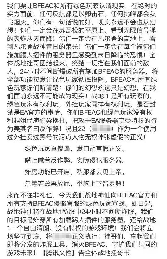 刚开始时许多人都以为,这只是一场玩家之间的口嗨,可后续发生的事情却渐渐失控了。双方的交锋不仅仅是在言语上,情况一度发展到互相下战书的地步,反挂组织觉得忍了这么久了,今后不该继续忍下去了;外挂联盟则要求绿色玩家不要挣扎,不然就连着《战地1》的服务器一起“玉石俱焚