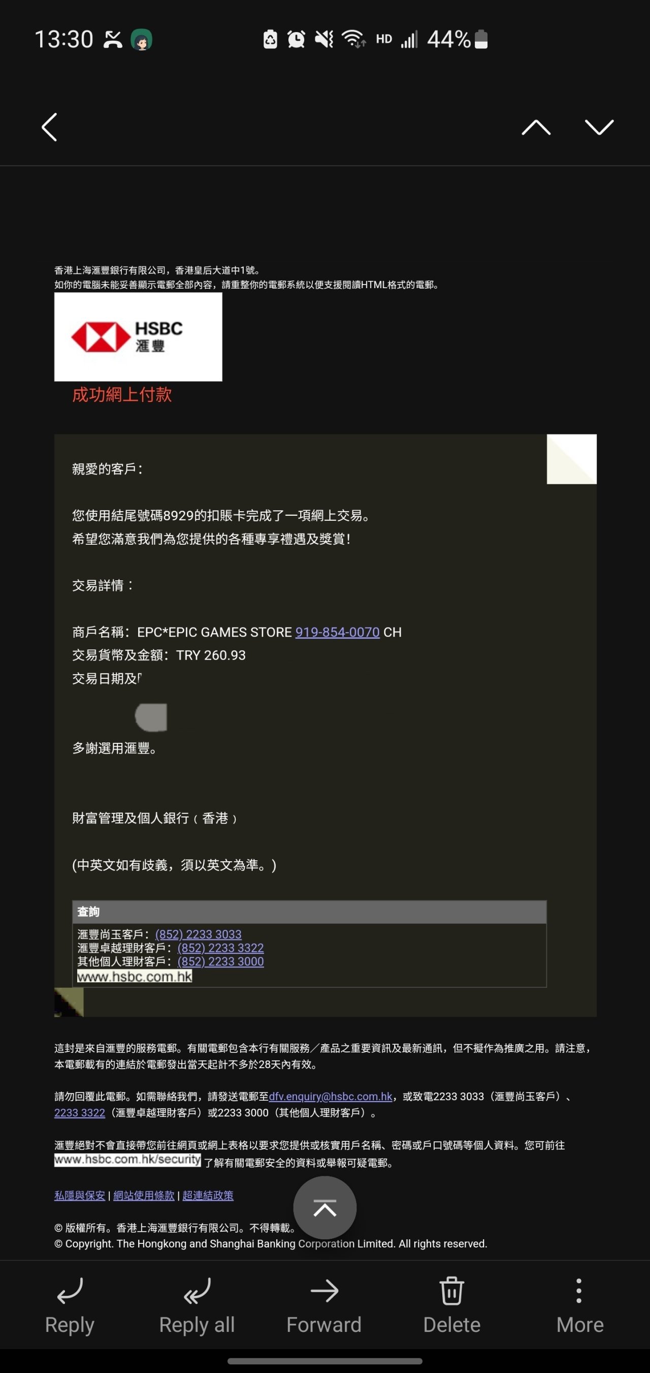 中银香港收到转账后,再通过转数快转账到自己的汇丰MasterCard银行卡。通过这个卡进行付款。