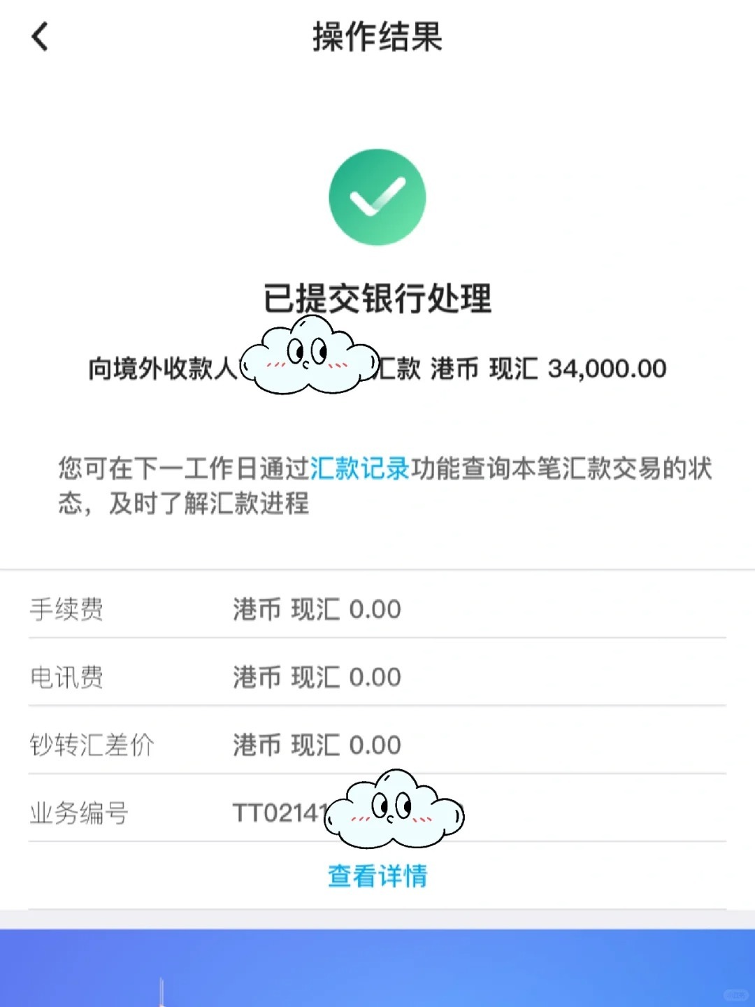 打开中国银行app→跨境汇款→境外中行→填写收款人信息以及转账金额(只有港币和美金免手续费)