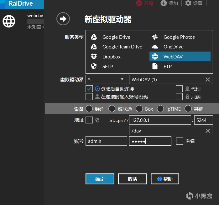 配置Raidrive:取消勾选地址框,账号密码与Alist一致,填写完毕确认。参考下图