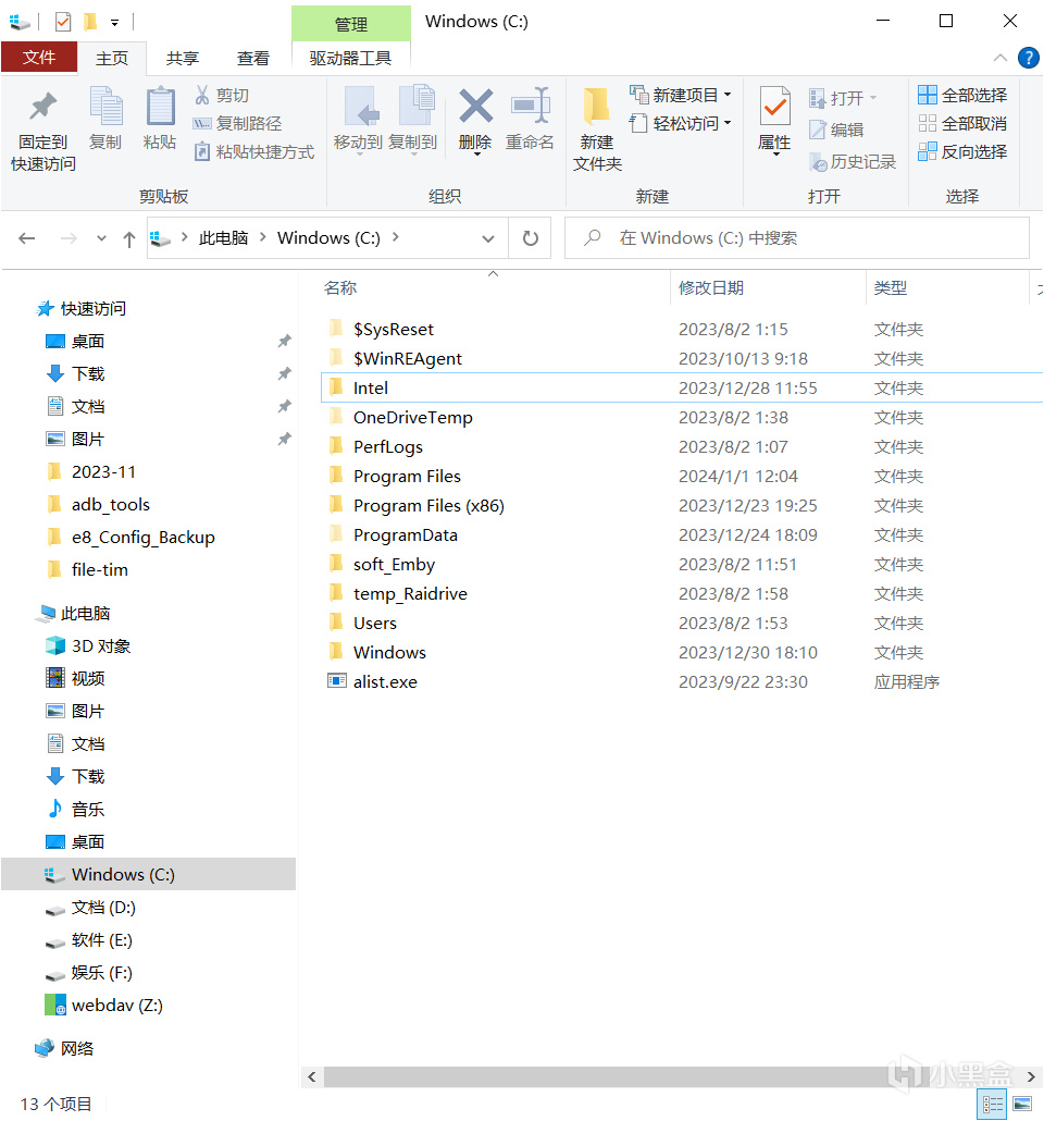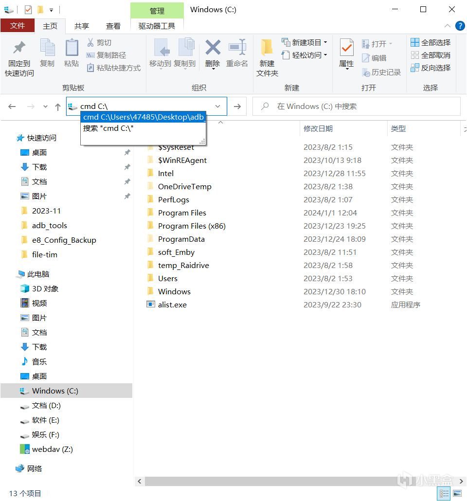 2、下载完成后,将压缩包解压得到文件“Alist.exe”至c盘根目录(推荐C盘,一般C盘为固态,响应速度快,其他盘亦可)。打开c盘根目录,在剪切板输入“cmd C:\”回车调出命令提示窗(cmd)。