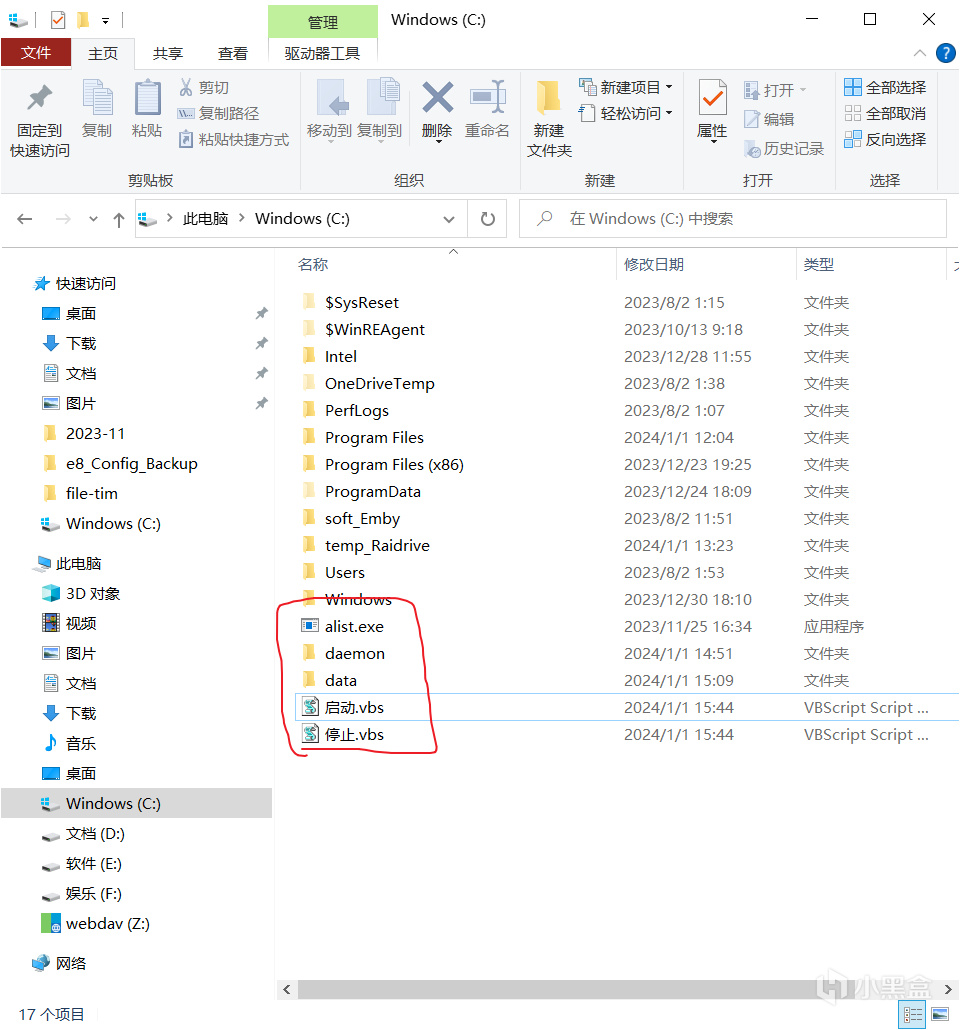 第一个为启动alist命令,我们命名为“启动”,第二个为关闭命令,命名为“停止”。文件后缀名改为vbs,放在C盘根目录(和alist.exe同一目录下)。